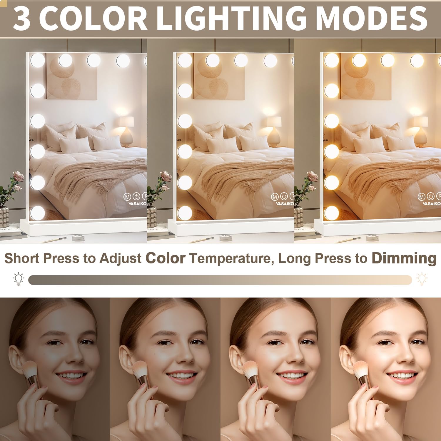 💡【𝐀𝐝𝐣𝐮𝐬𝐭𝐚𝐛𝐥𝐞 𝐋𝐢𝐠𝐡𝐭𝐢𝐧𝐠 𝐚𝐧𝐝 𝐒𝐭𝐞𝐩𝐥𝐞𝐬𝐬 𝐃𝐢𝐦𝐦𝐢𝐧𝐠 -Adjustable Brightness And three Colour Lighting Modes】VASAIKO led mirror options 3 lighting modes: chilly mild, heat mild, and pure mild. Lighted make-up mirror with 50,000 hours life Max 6000 Lumens excessive brightness LED Mild Strip, and the brightness could be adjusted 10%-100%, which may completely meet your totally different make-up wants and make your make-up extra delicate. LED vainness mirror with lights could be adjusted in keeping with your wants.
