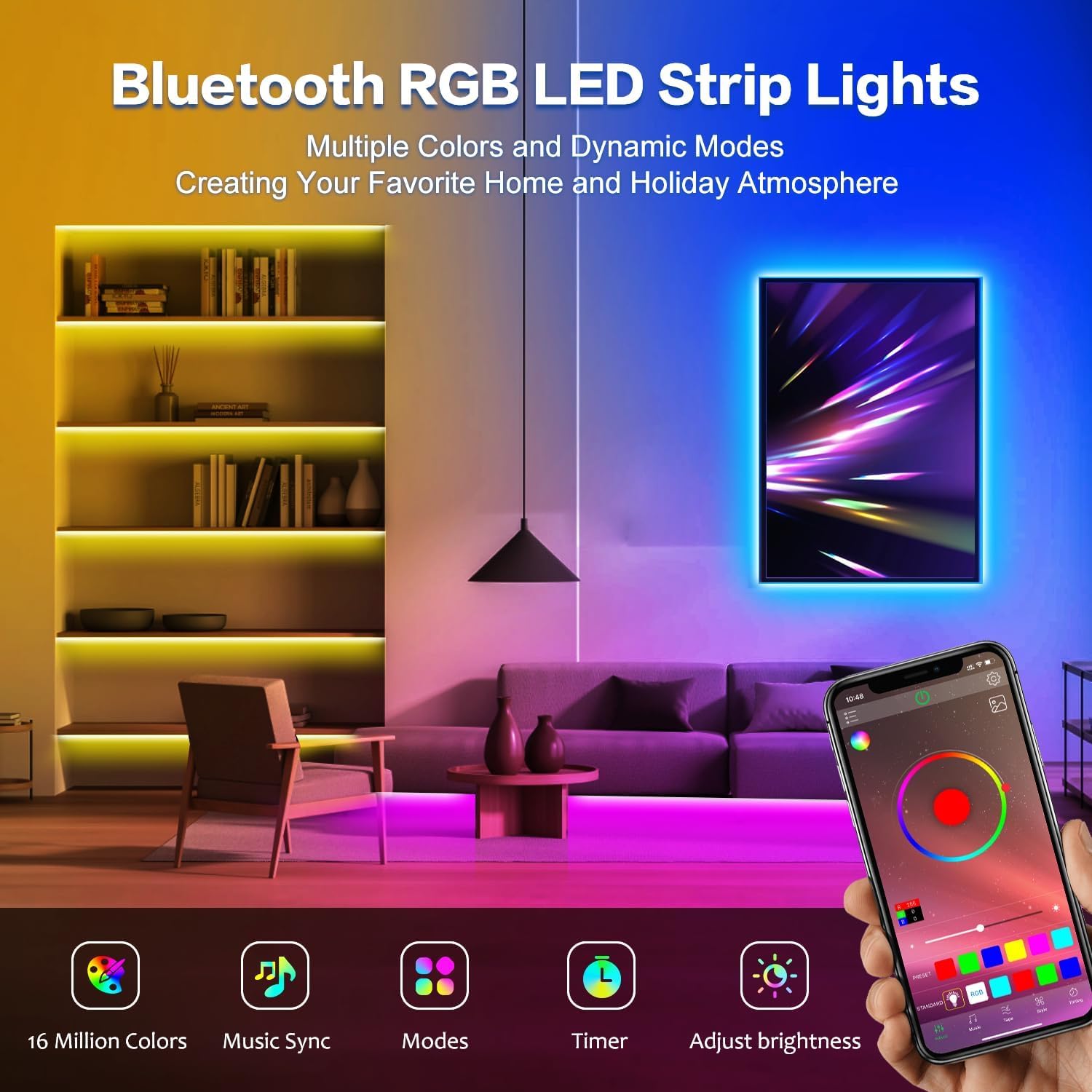 With a secure Bluetooth connection, the led strips provide adjustable brightness, energy the lights on/off and a number of colours, which may be managed by the APP “Completely happy Lighting”. You possibly can dim the room lights and set a favourite colour through the APP with out leaving your mattress. You possibly can play together with your kids in dynamic lighting modes and vibrant mild colours. The superb strip lights create a heat and comfy ambiance in your room.