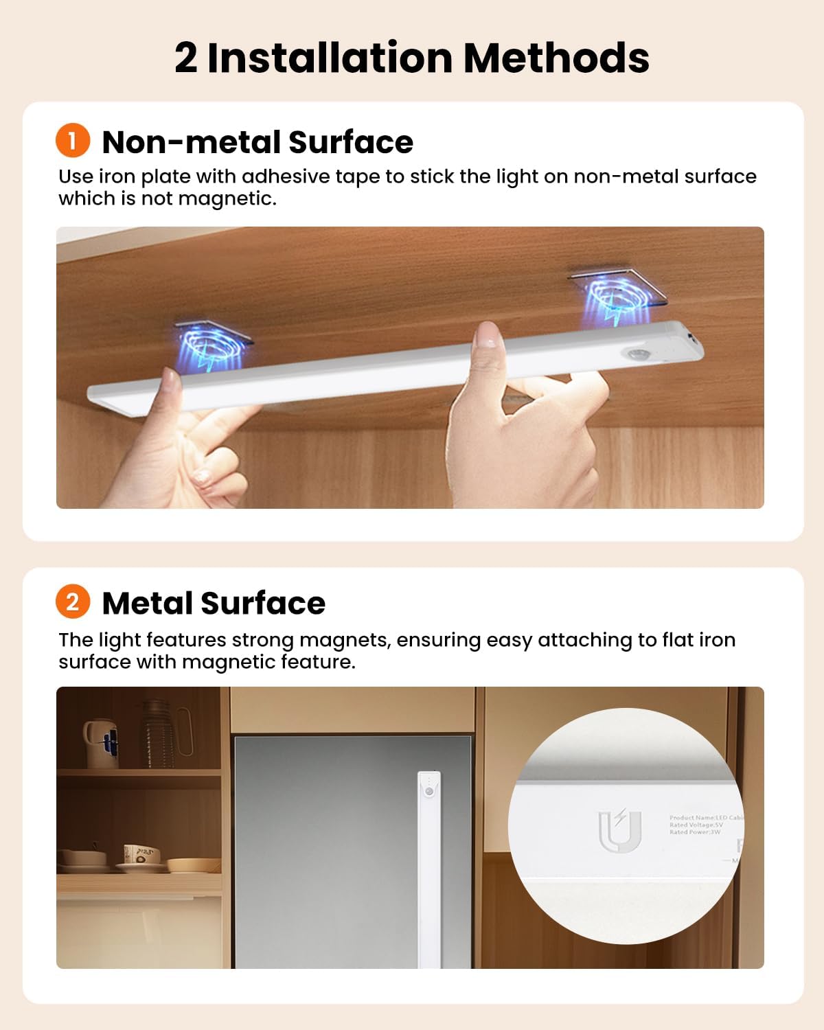 [Easy Installation]: The LED cupboard gentle options built-in robust magnets on each ends, permitting you to immediately stick the sunshine in your desired positions of flat ironwork floor, no want to make use of additional instruments, additionally making the cupboard gentle straightforward to be indifferent for recharging; We additionally present iron plates and adhesive tapes for straightforward attaching the sunshine on any non-metal floor