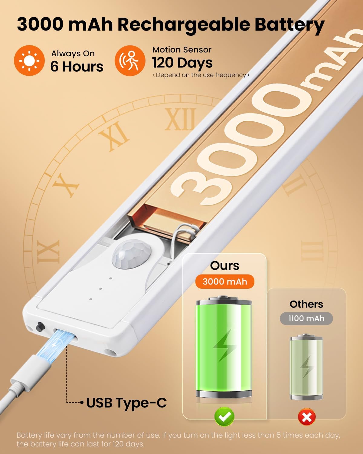 [USB Rechargeable Design]: Our underneath cupboard gentle is supplied with 3000 mAh rechargeable battery, offering steady lighting with max. Brightness for six hours in All the time-ON mode or working time as much as 120 days in movement sensing mode (relying on how typically you employ it), making certain cordless use for various utilizing scenes; The included USB type-c charging cable gives straightforward plugging and quick charging, making certain totally charging the cupboard gentle in about 4 hours