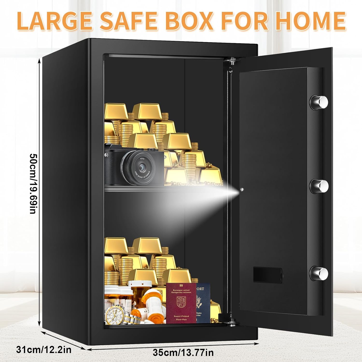 【LARGE SAFE BOX FOR HOME USE】Exterior measurement: 19.69 x 13.78x 12.2 inches (H x W x D), Inside measurement: 19 x 13 x 12 inches (H x W x D). The burden: 33 kilos. The big interior area can meet your each day storage wants and with a detachable metal shelf that provides versatile storage choices on your valuables. Excellent reward for houses, hotle, dorm and workplaces