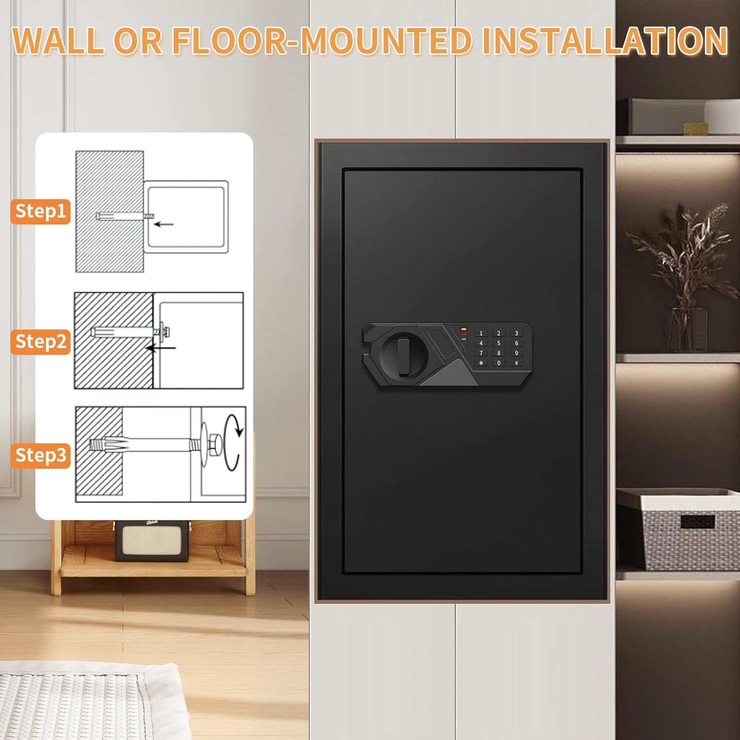 【INSTALL TO THE WALL/CLOSET/FLOOR】: Our house secure has pre-drilled holes within the backside and again, which lets you set up the secure for everlasting wall or flooring to keep away from eradicating by the theft