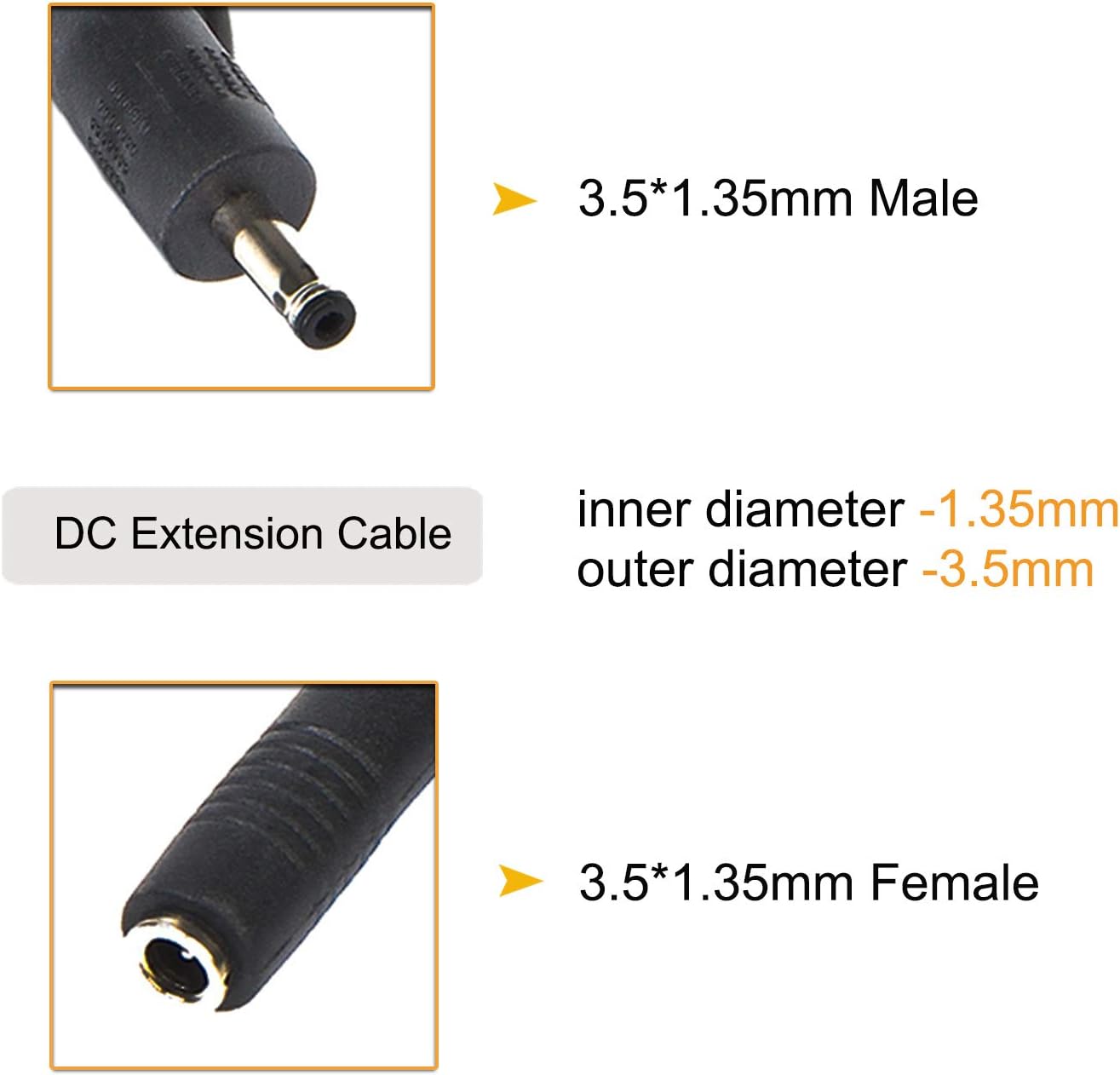 DC Feminine to Male Extension Cable. Male 3.5mm x 1.35mm connector on one finish; feminine 3.5mm x 1.35mm connector on different finish