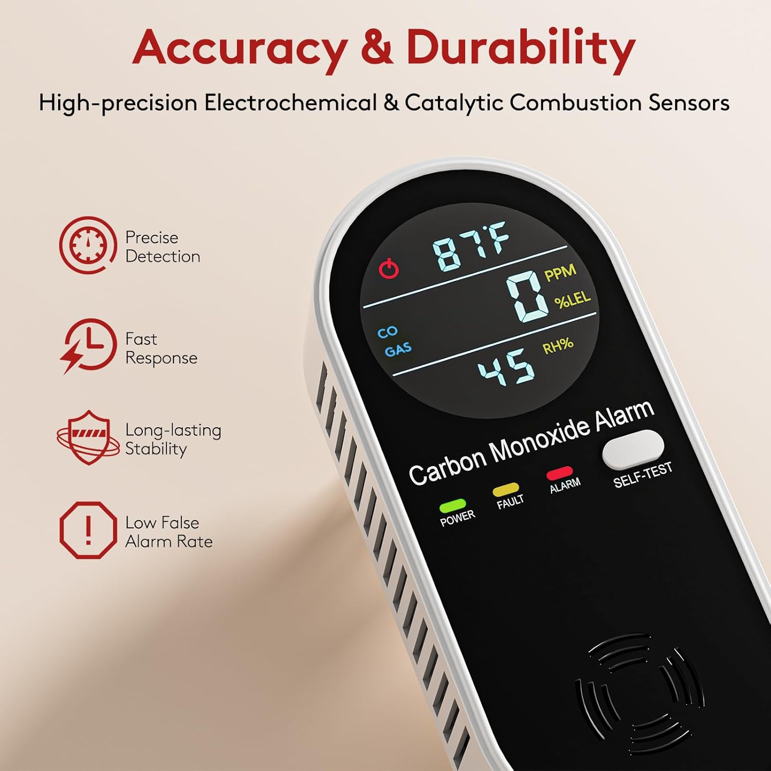 【EMERGENCY LIFE-SAVER】Deafening alarm ( over 85dB) telling you to open the window and door + flashing purple gentle prompts when gasoline/CO reaches a sure degree, offering well timed alerts to any potential hazard.