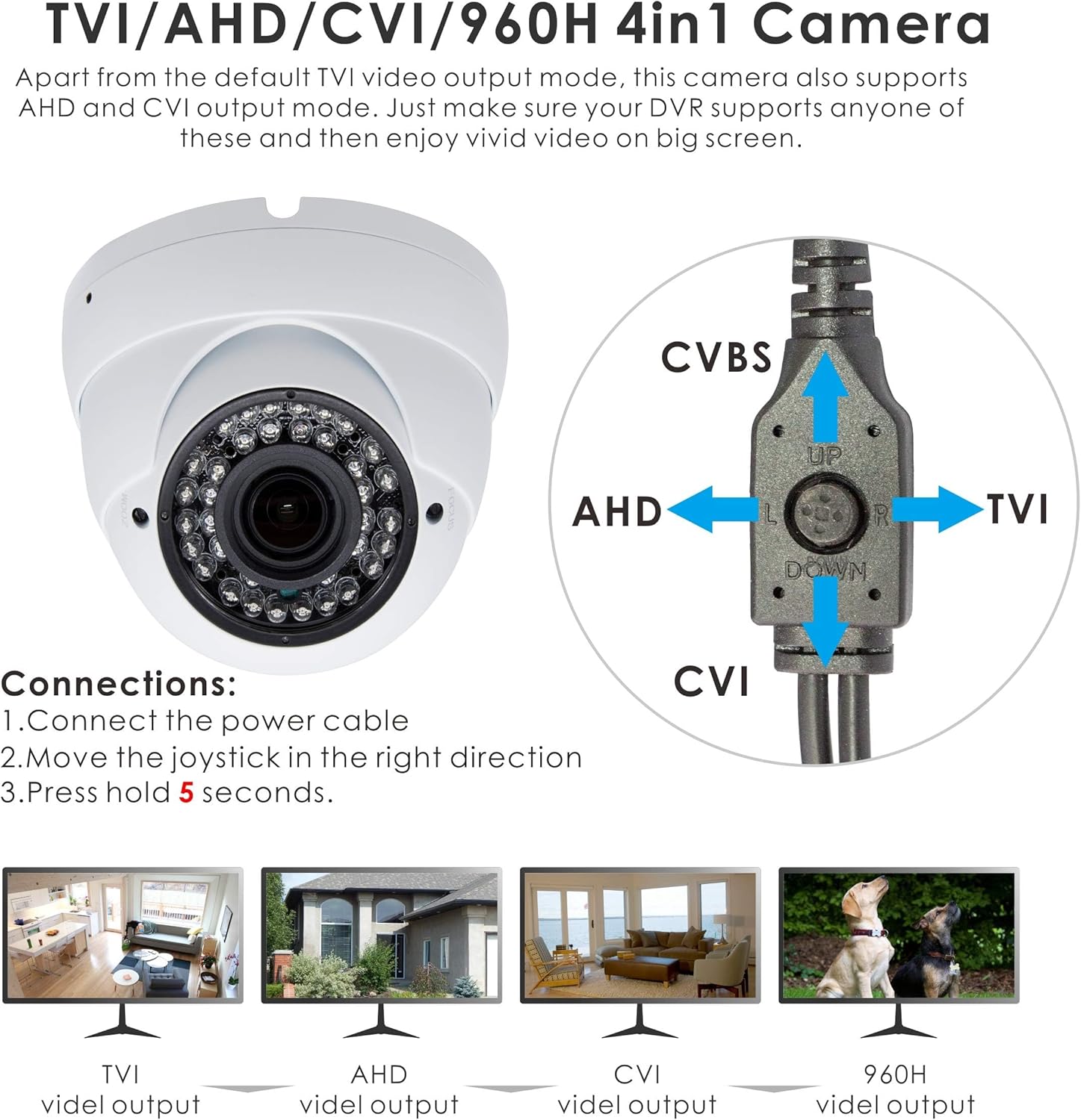This CCTV digital camera helps TVI/AHD/CVI/960H CVBS (Analog) 4 Modes of video output.The default video mode is 5MP TVI, please change to corresponding VIDEO MODE by Joystick cable in accordance with your DVR earlier than use.