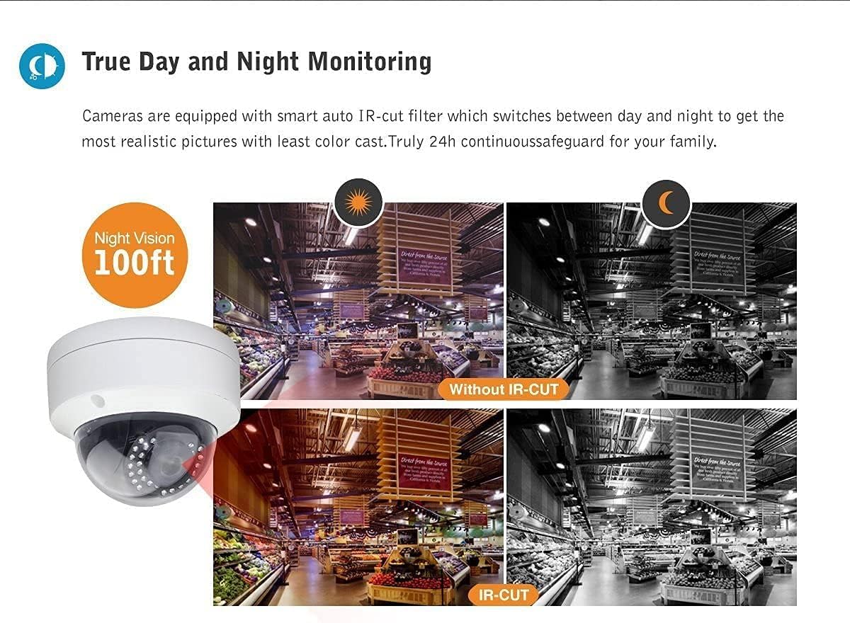 30m IR evening imaginative and prescient. Vary as much as 100ft in ambient lighting. Irrespective of how darkish the evening is, this digital camera comes with infrared LEDS built-in, which can consistently offer you ultra-clear evening imaginative and prescient for as much as 100ft away, actual all-day safety monitoring.