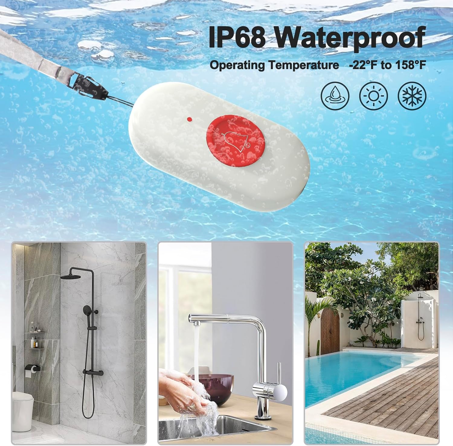 【IP68 Waterproof】This panic button is IP68 Waterproof designed with resilient to water and mud operate, which works even in toilet bathrooms or wet day.