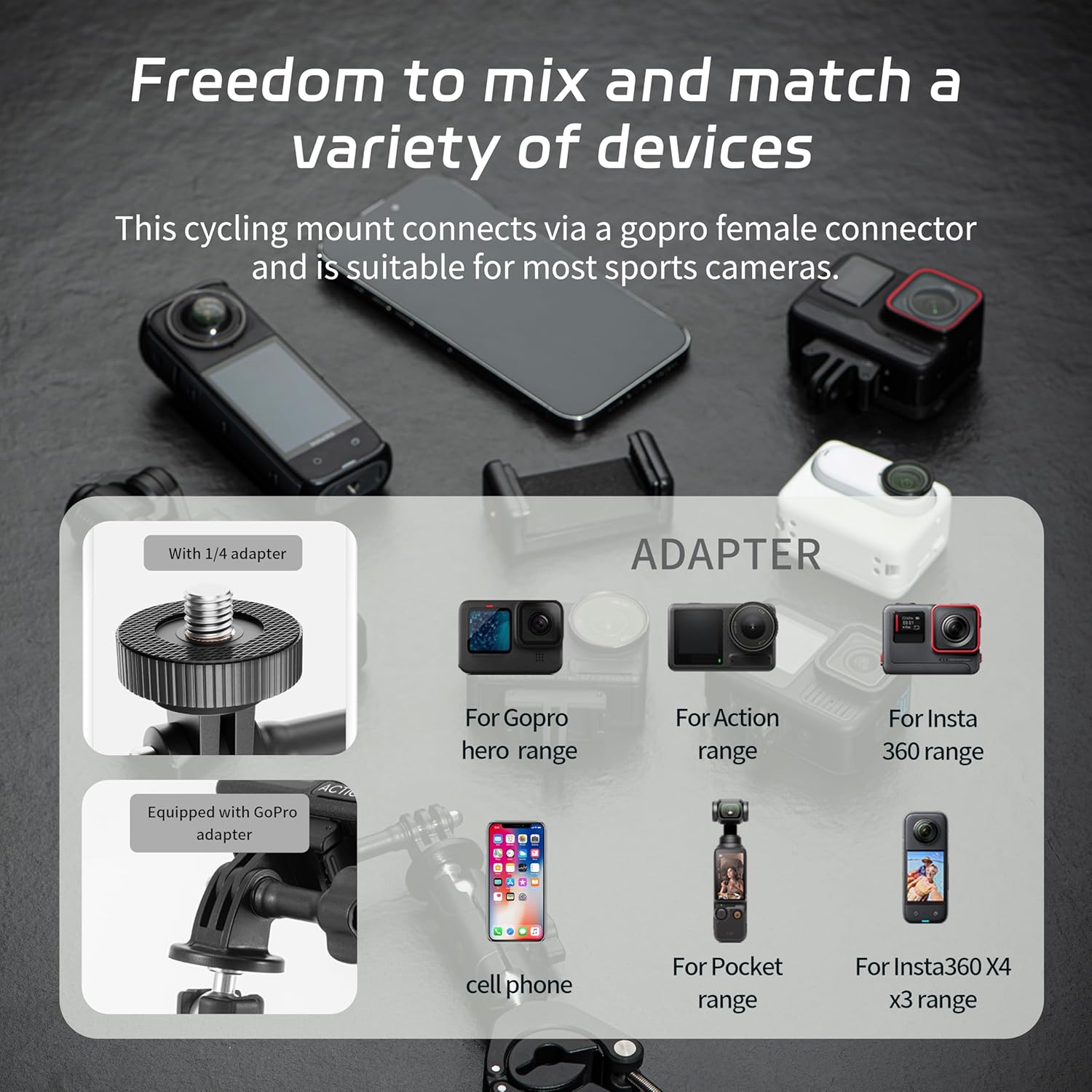 Huge Vary of Relevant Gear:This biking mount connects through a for gopro feminine connector to simply mount a sports activities digicam and shortly begin capturing,Appropriate for GoPro Hero/for DJI Motion Cameras,Appropriate for many sports activities cameras