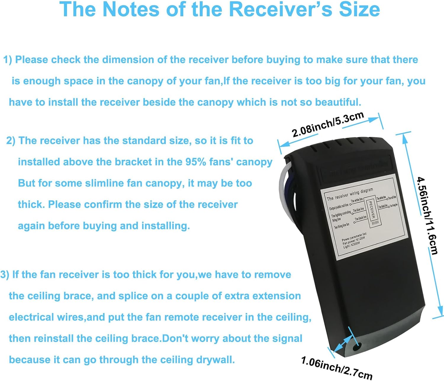 Bundle Included:The distant management equipment features a transmitter and a receiver, Batteries will not be included.And the scale of the receiver is 4.56*2.08*1.06 inches,please affirm upfront whether or not the ceiling fan cover CAN ACCOMMODATE the receiver earlier than shopping for.