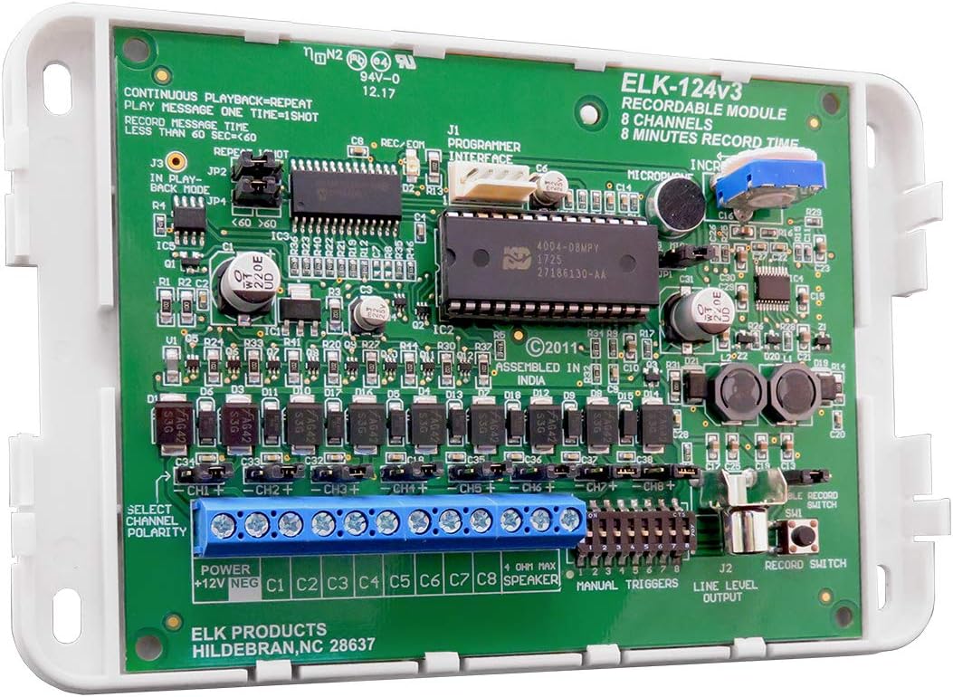The ELK-124 v.3 is a brand new and enhanced 8 channel recordable voice module. It’s splendid for functions akin to phone on-hold bulletins, safety and entry management warnings, museum narrations, and extra. Every channel can maintain as much as 1 minute of recorded voice and/or music with a mixed whole document time of 8 minutes. Recording is fast and simple utilizing the built-in microphone and push to document button. A line-level output jack permits connection to exterior amplifiers, audio tools, and paging techniques. It options handy channel activation switches and the power to play every channel as soon as or to repeat endlessly. Every channel will settle for a momentary set off. Constructed-in condenser microphone for recording. Adjustable speaker quantity and present draw. Highly effective 24 watt audio amplifier for Audio system. Line Stage Output for Amplifiers and Paging Programs. PC sound card interface connector. Working Voltage: 11 to 14 Volts DC. Present Draw: .2 to 2 Amps, (relies on quantity setting and speaker loading). Sound Stage: 122 db @ 1 meter, 14 vdc. Max. Speaker Loading: 4 Ohms. Max. Message Size: 1 minute per channel or 8 minutes for a mixed single channel.