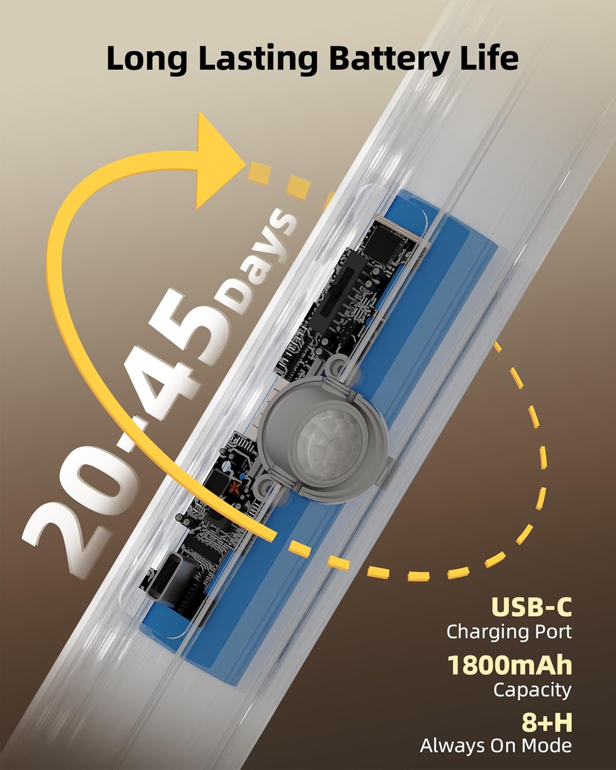 Lengthy-Lasting Rechargeable Battery: Our wi-fi LED mild incorporates a built-in 1800mAh battery, offering 20 days (75 activations/day) to 45 days (30 activations/day) of sensible operation in auto mode, or 8+ hours of steady use. It features a USB-C charging port and comes with a USB-C cable for handy charging.
