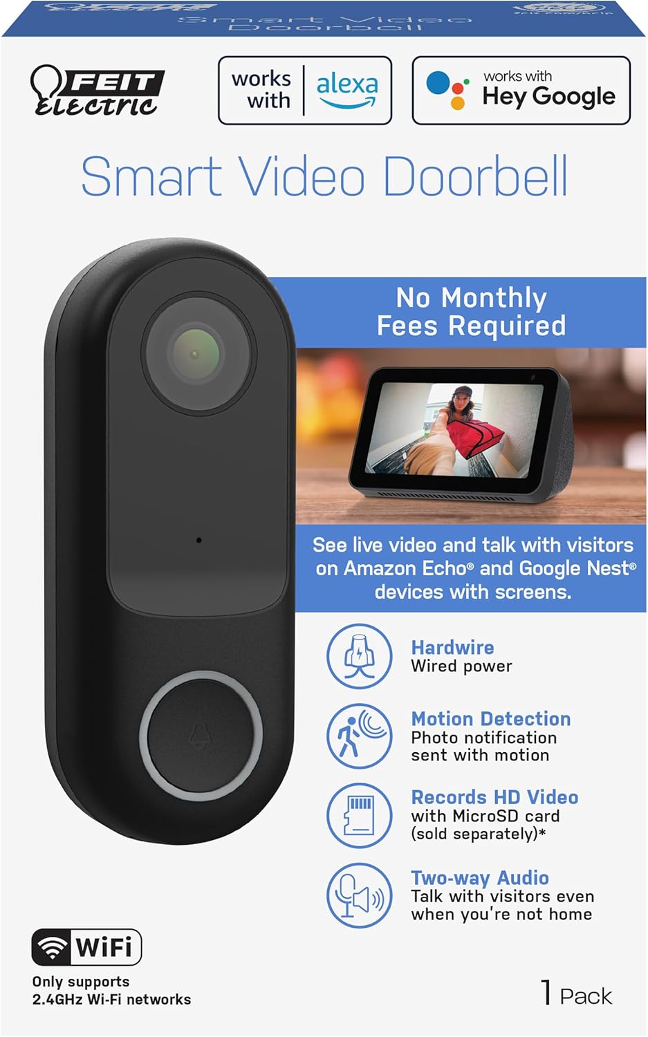 Feit Electric Doorbell Camera, Wireless Video Doorbell, 2.4 GHz WiFi, No Hub, Two-Way Audio, Motion Detection, Night Vision, 1080p HD, Micro SD Card Storage, Hardwired, CAM/Door/WiFi