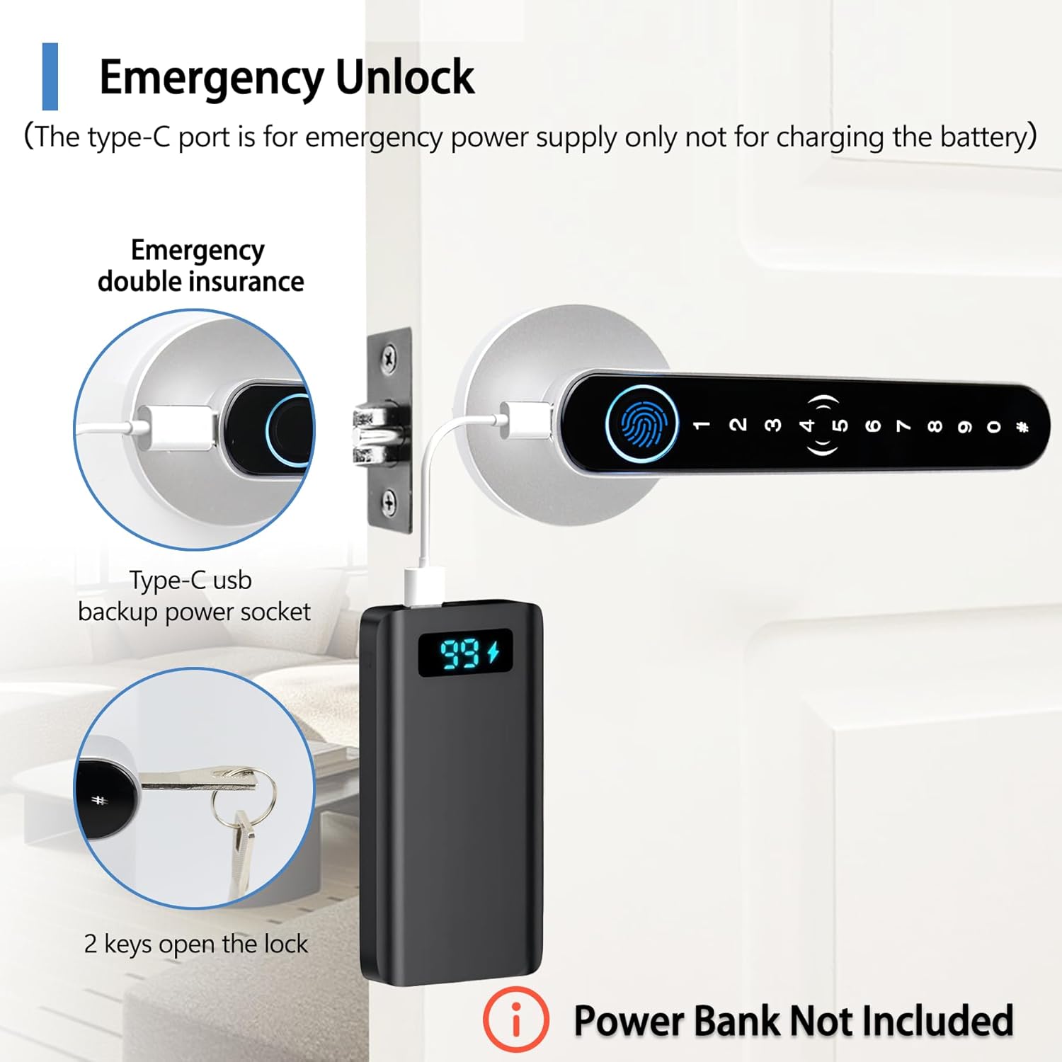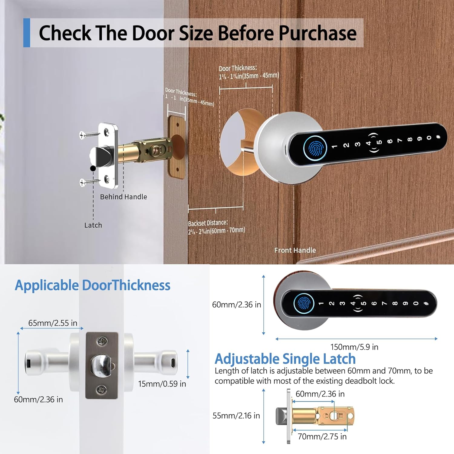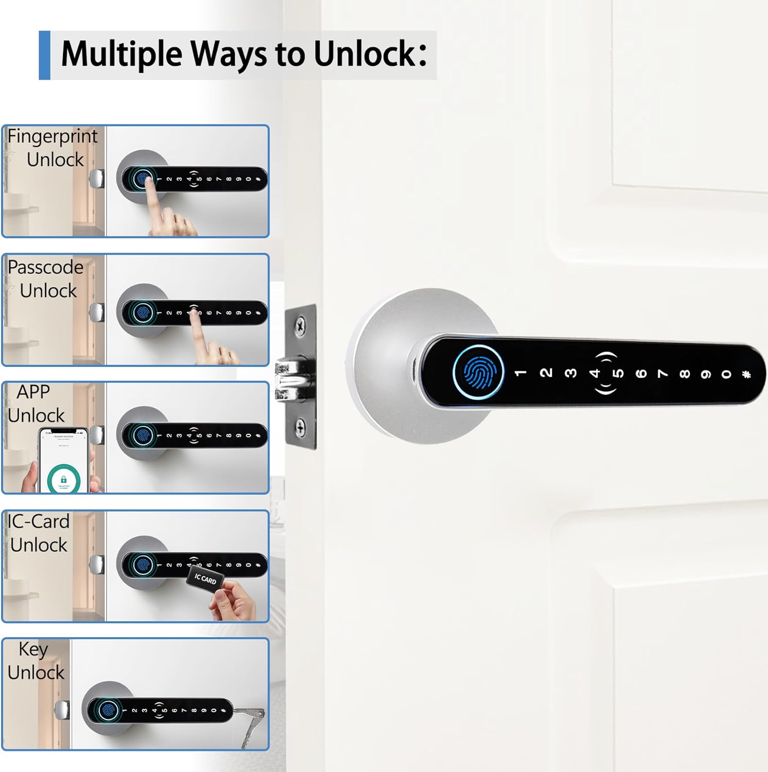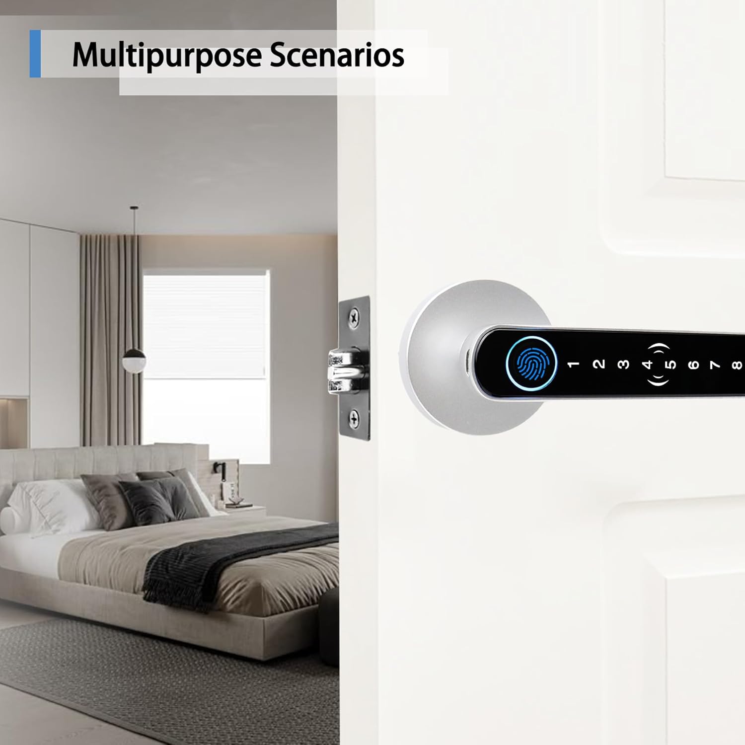 Fingerprint Door Lock, Keyless Entry Door Lock with Handle, Electronic Door Lock with Keypad for Bedroom Home Apartment Hotel, APP Control (Metallic Silver)