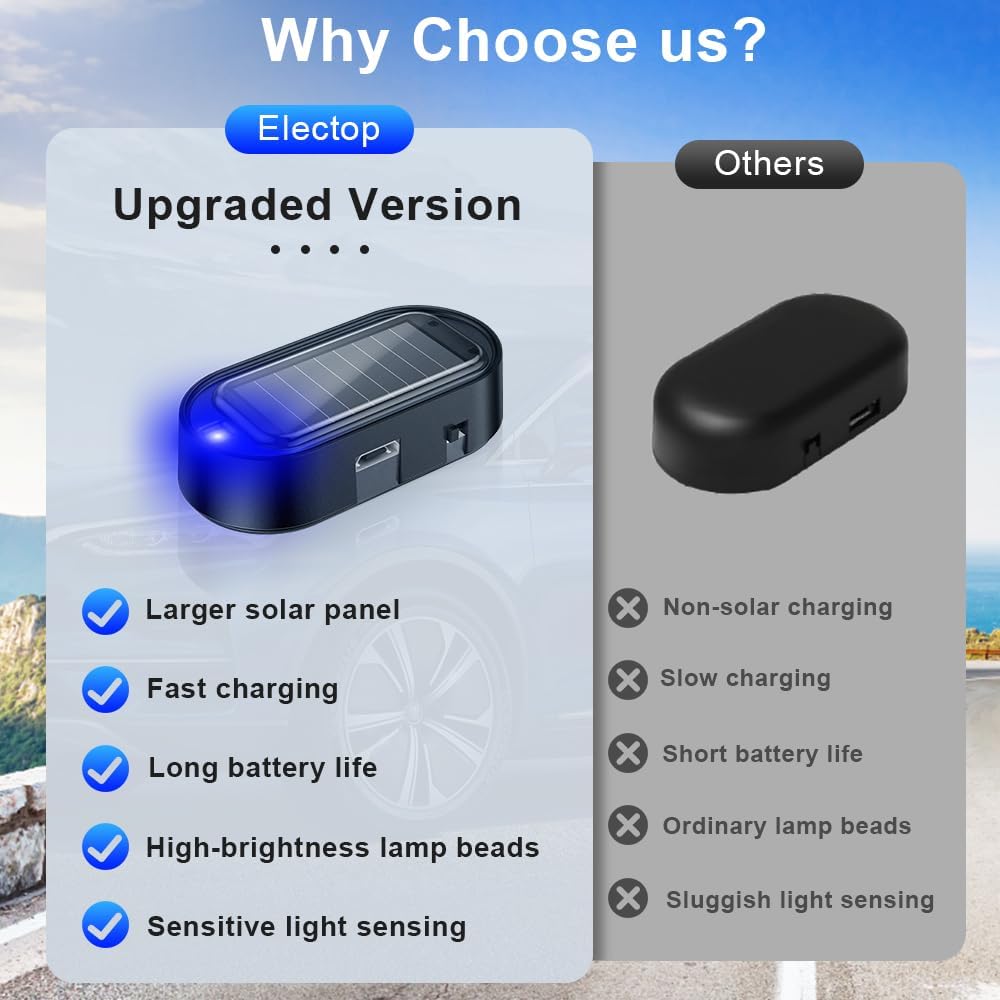 Our automotive simulator alarm gentle by Electop outshines the competitors with its bigger photo voltaic panel, quick charging capabilities, and lengthy battery life. The high-brightness LED lamp beads and delicate gentle sensing know-how present optimum efficiency and peace of thoughts.