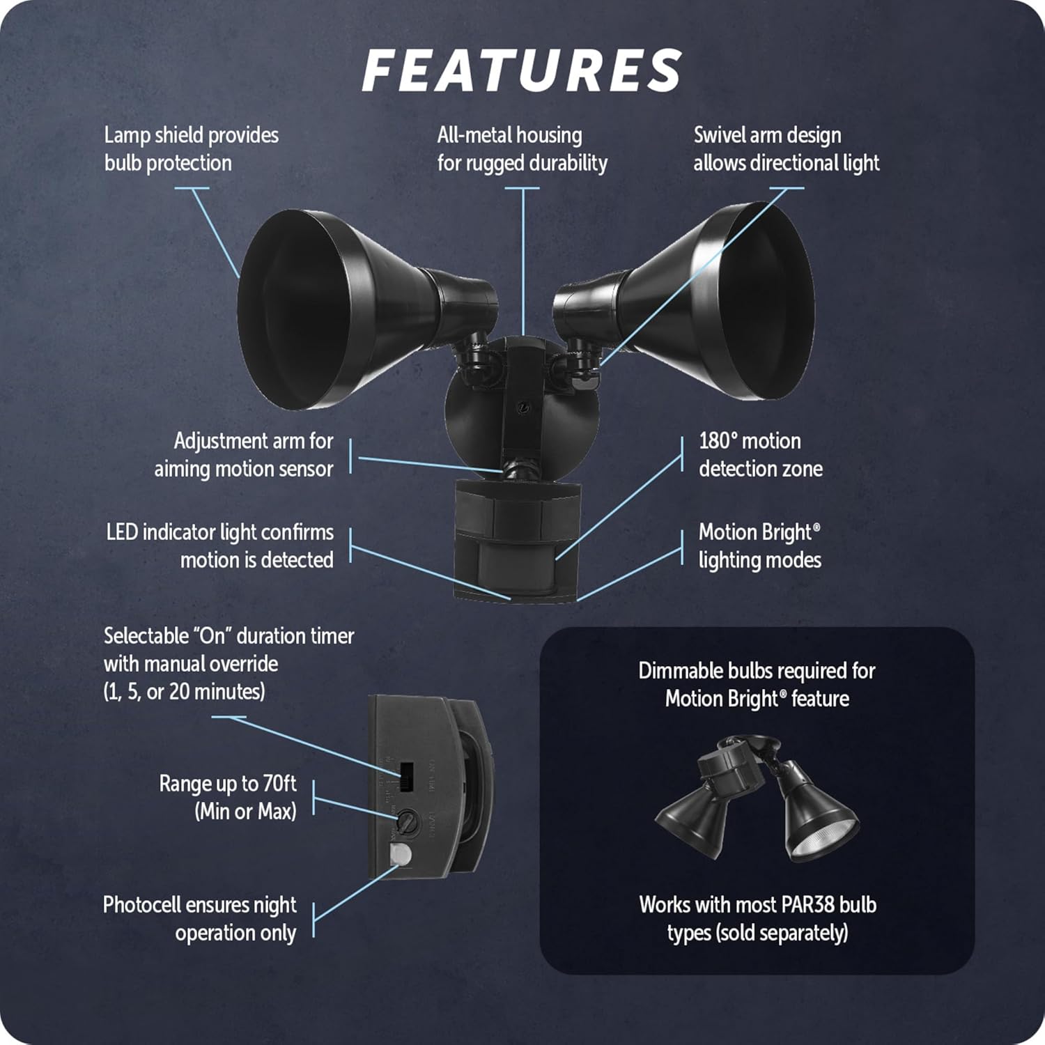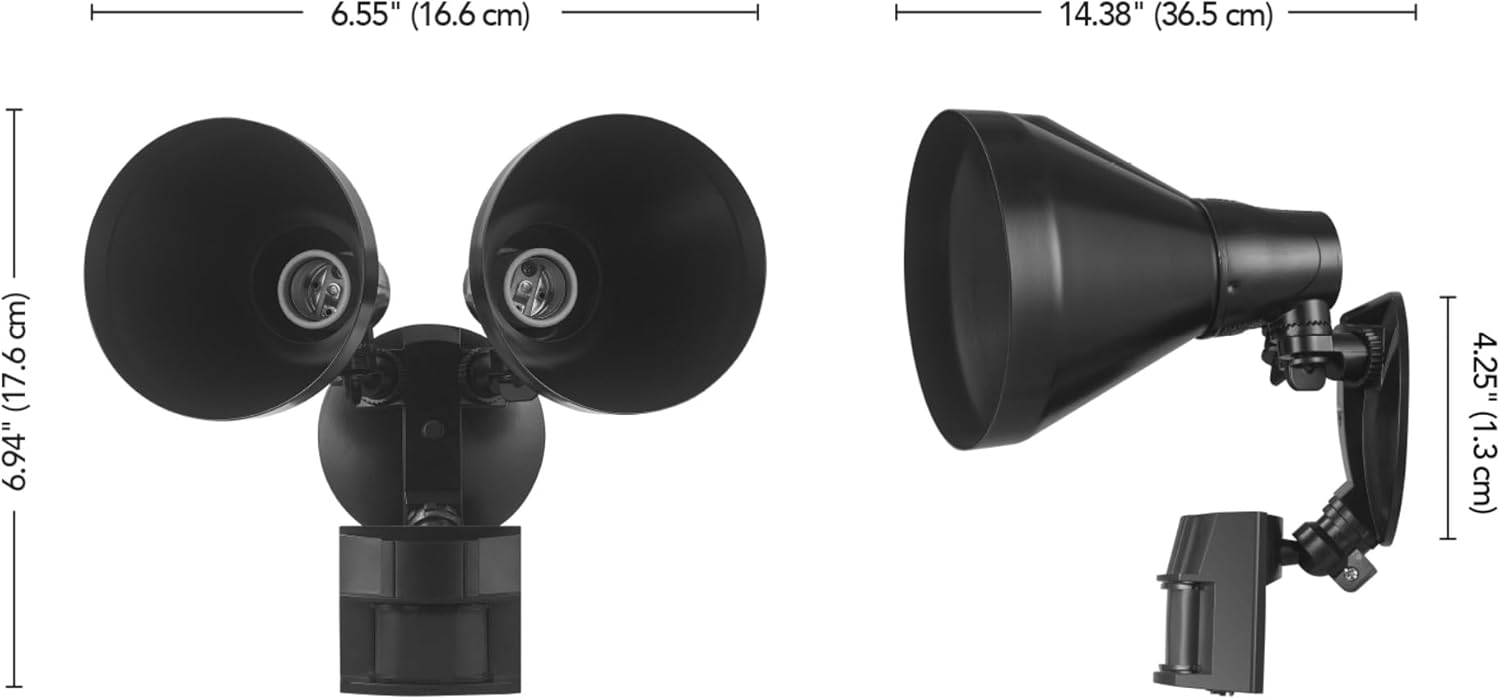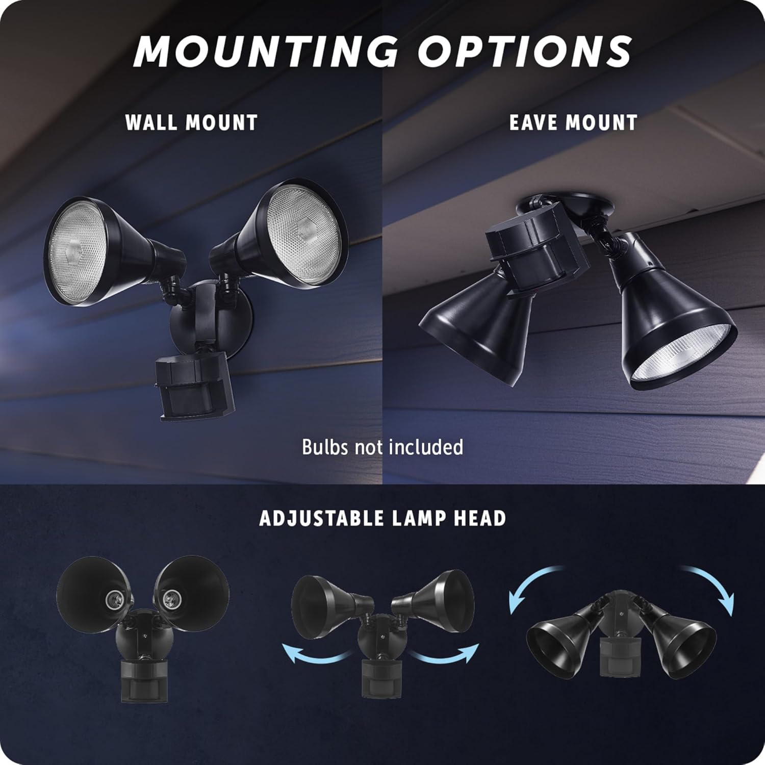 Improve your outside areas with the Movement Sensor Swivel Arm MotionBright Safety Flood Gentle. Expertise movement detection capabilities from all angles with a outstanding vary of as much as 70 toes or 21 meters and a 180° detection zone. Routinely turning off after 1, 5, or 20 minutes provides you the pliability to decide on the period that fits your wants. The Swivel Arm Design permits straightforward adjustment of lamp heads for personalized gentle protection whereas the MotionBright characteristic retains gentle at a low setting till movement is detected when it goes to full brightness. Use 2x Dimmable Commonplace Base E26 PAR38 Form 120W Max Bulbs (offered individually). Set up effortlessly with the Twin Mount system which incorporates all mounting {hardware} to provide the choice to wall mount or eave mount, and luxuriate in its weather-resistant, sturdy building. Good for pathways, sheds, garages, and extra. Backed by a 2-year guarantee, you’ll be able to belief within the Globe Electrical dedication to high quality.