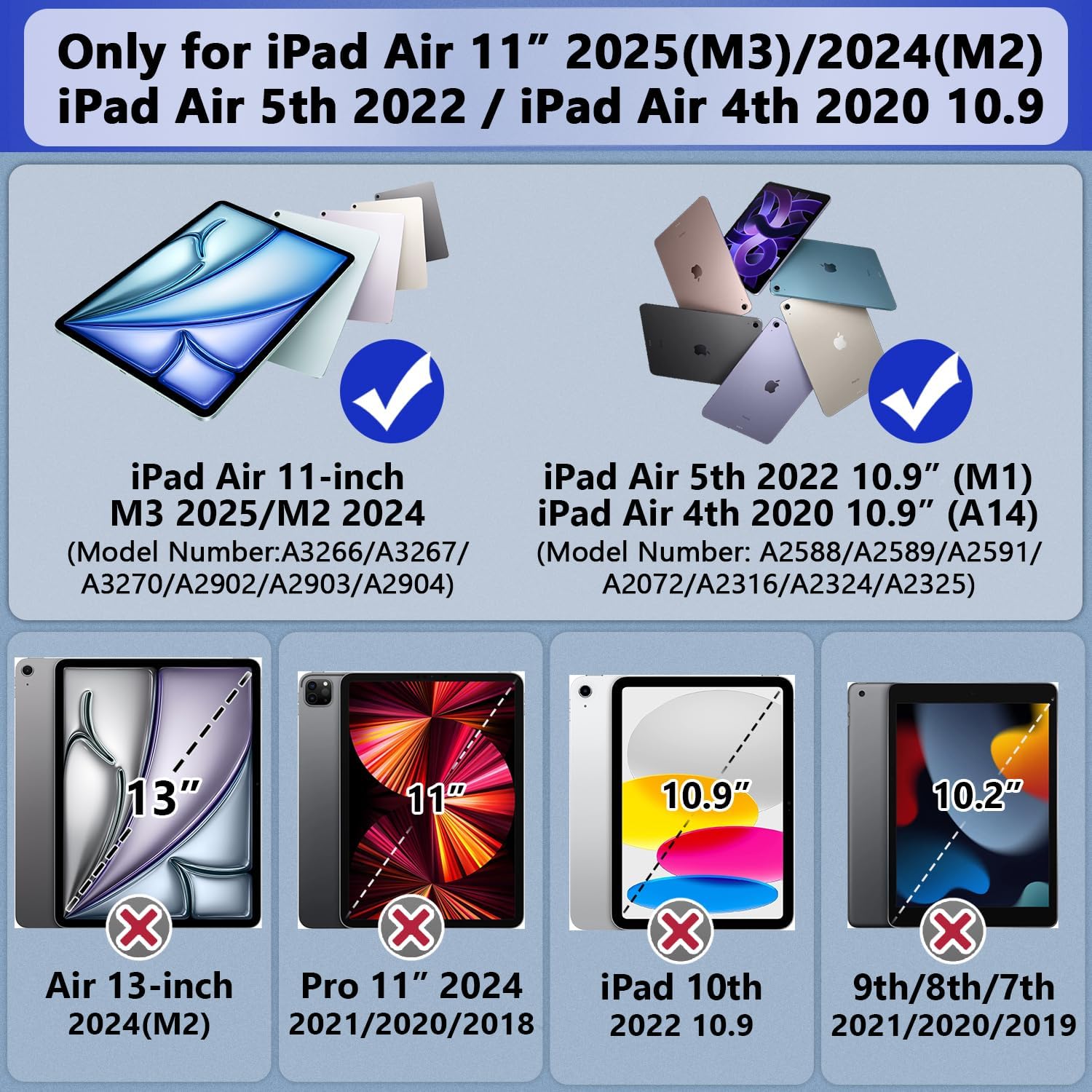 Compatibility: It is solely designed for iPad Air 11-inch (M3)2025 / (M2)2024 and iPad air fifth/4th era (Air 10.9 inch 2022/2020). Mannequin quantity:( A3266/A3267/A3270/A2902/A2903/A2904/A2588/A2589/A2591/A2072/A2316/A2324/A2325). (Not for iPad Professional 11)