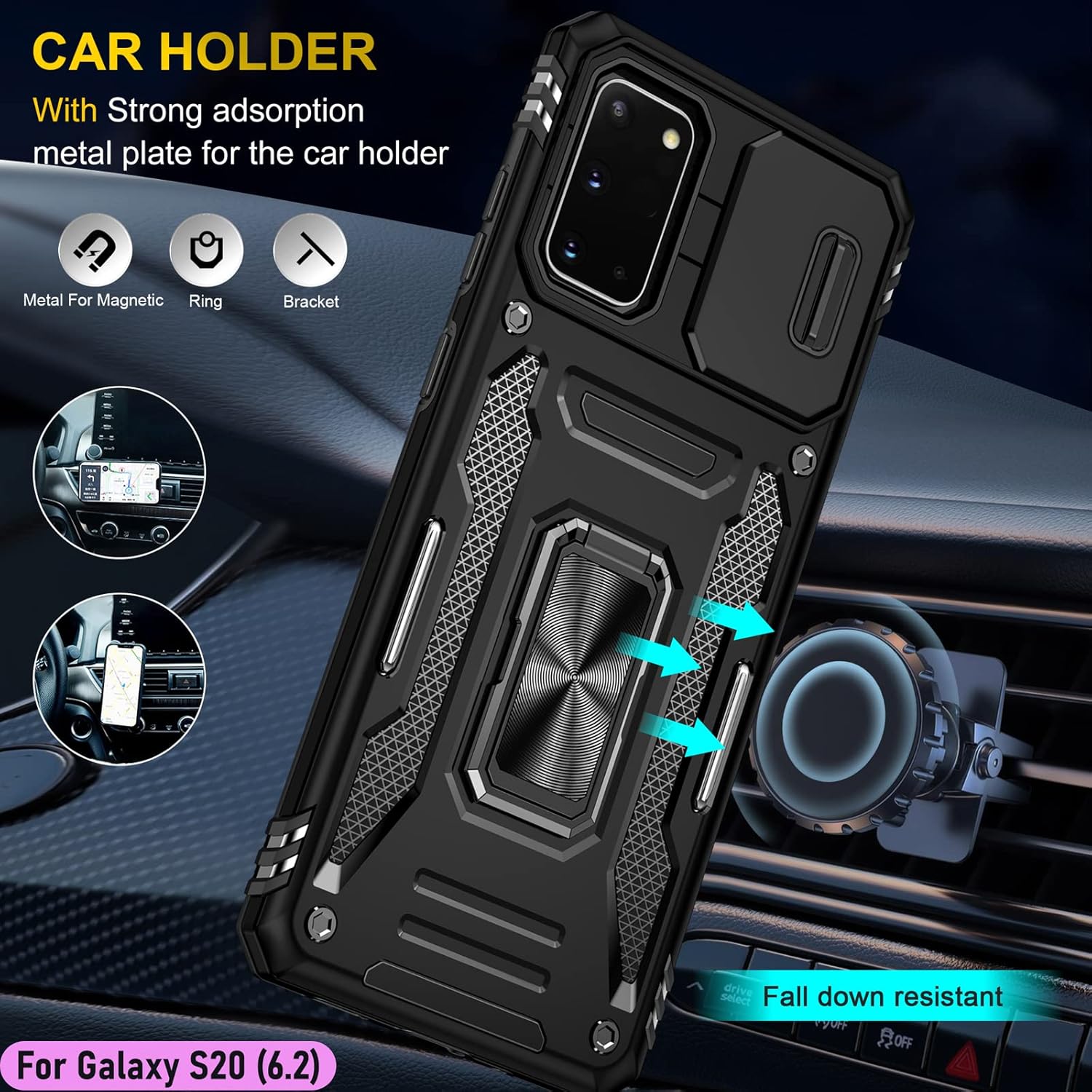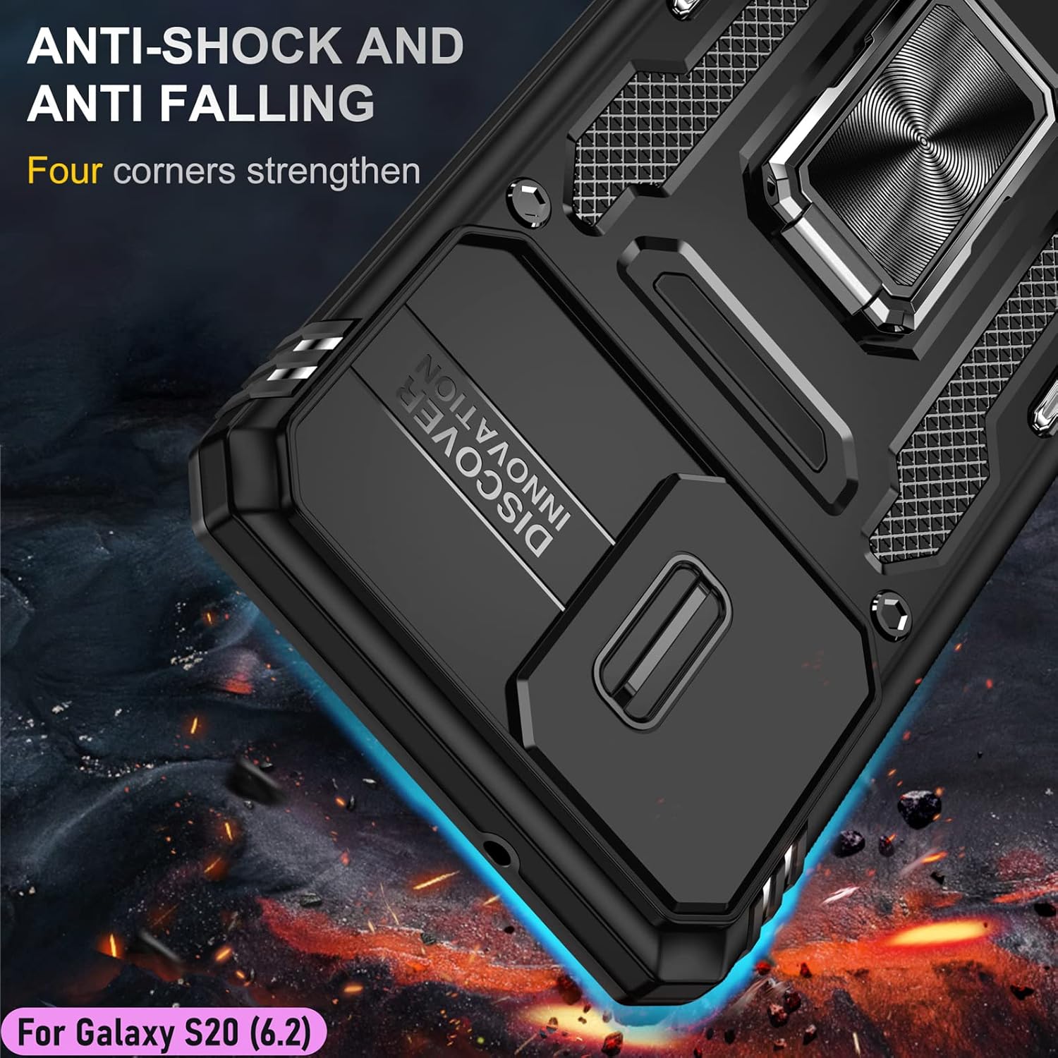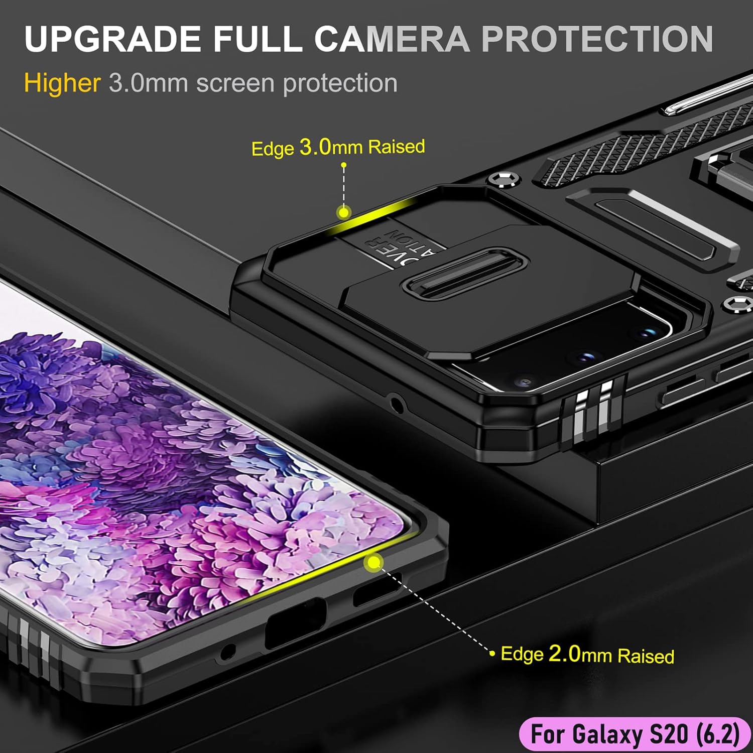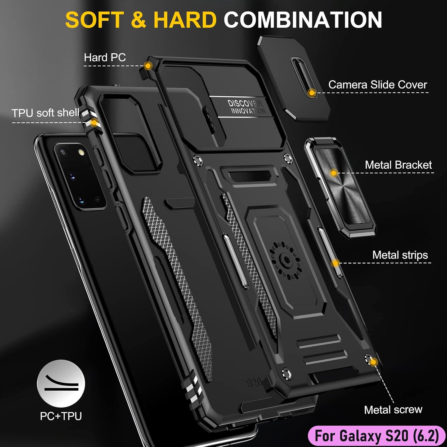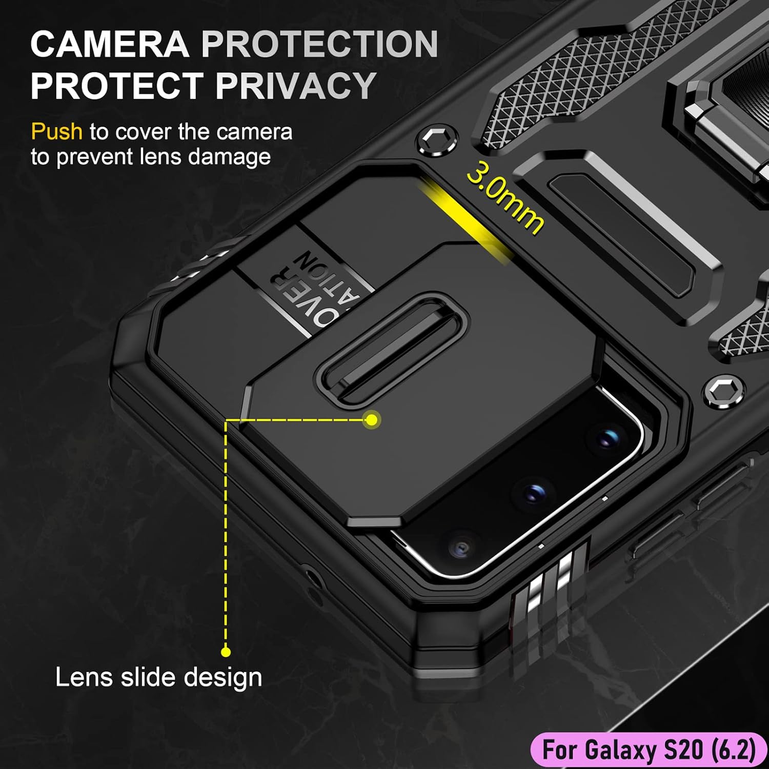 Heavy Duty Case for Samsung Galaxy S20, Military Grade Dual Layer Hybrid Cushioning Rubber Bumper Protector with Slide Camera Protector, Built-in 360 Degree Swivel Stand -Black