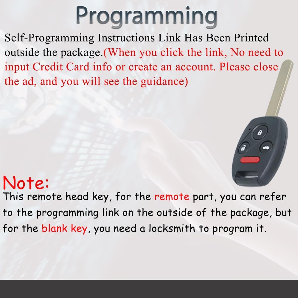【Programming Methord】These remotes can self-programmed,however for the clean key, you want a locksmith to program.【Discover】Don’t want to offer any credit score data, simply shut the advert. when clicking on the hyperlink of instruction web site.