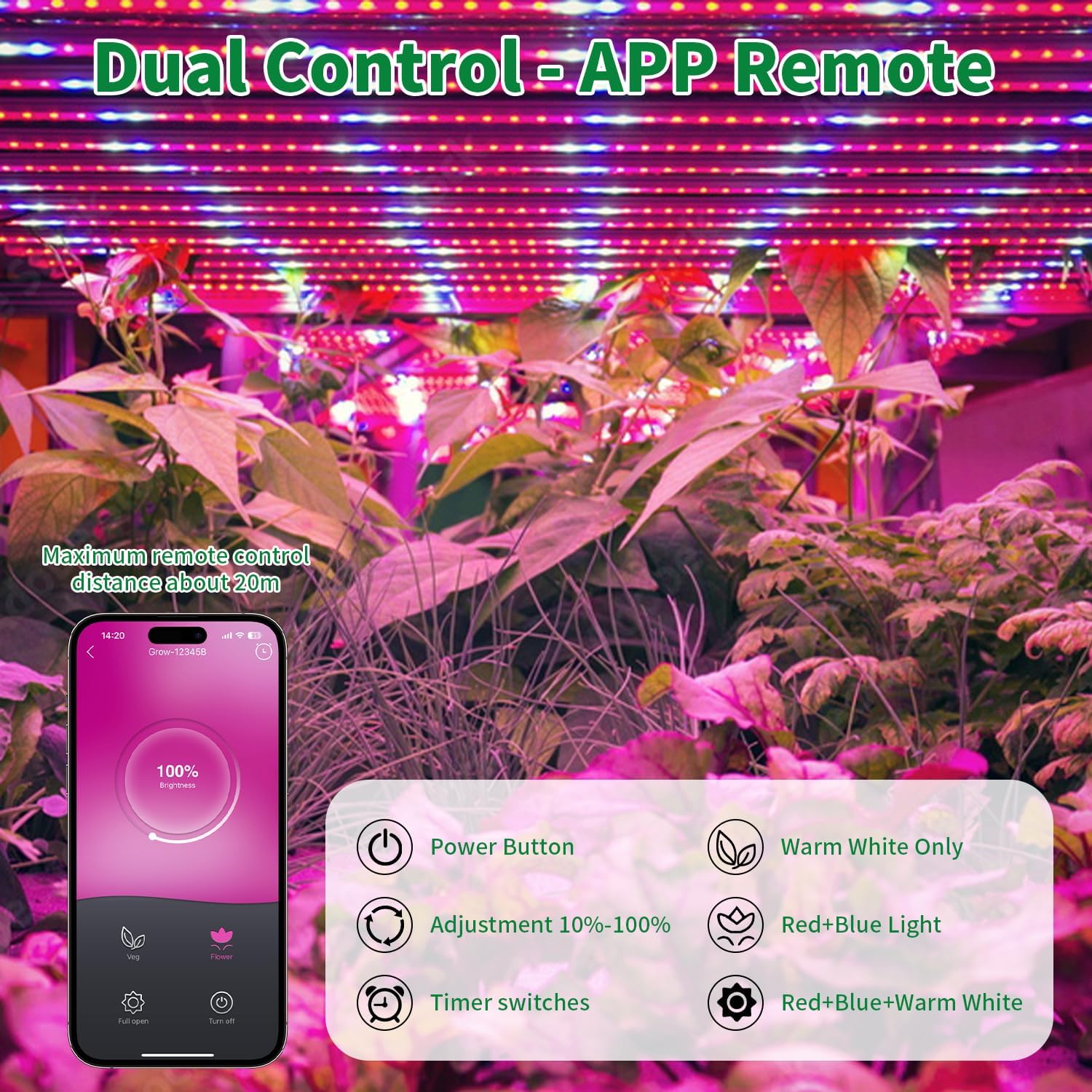 DUAL CONTROL AND 3 SWITCH MODES: Our plant develop gentle has two management modes – 2.4G distant management (inside 30 metres) and sensible app management (inside 20 metres); 10 ranges of dimming; 3 spectral modes to select from comparable to heat white, pink + blue, pink + blue + heat white, and so on., which successfully dietary supplements the dearth of pure gentle and promotes the expansion of vegetation at totally different levels.