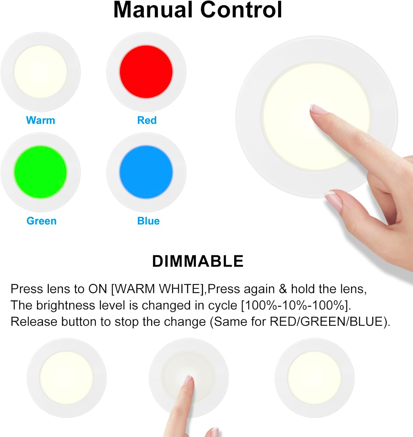 [Color Changing & Dimmable Stick on Light]Effortlessly change between heat white, crimson, inexperienced, and blue gentle with a easy faucet on the lens. For exact brightness management, use the distant to pick your most popular coloration and regulate the brightness from 100% to 10% with the press of a button