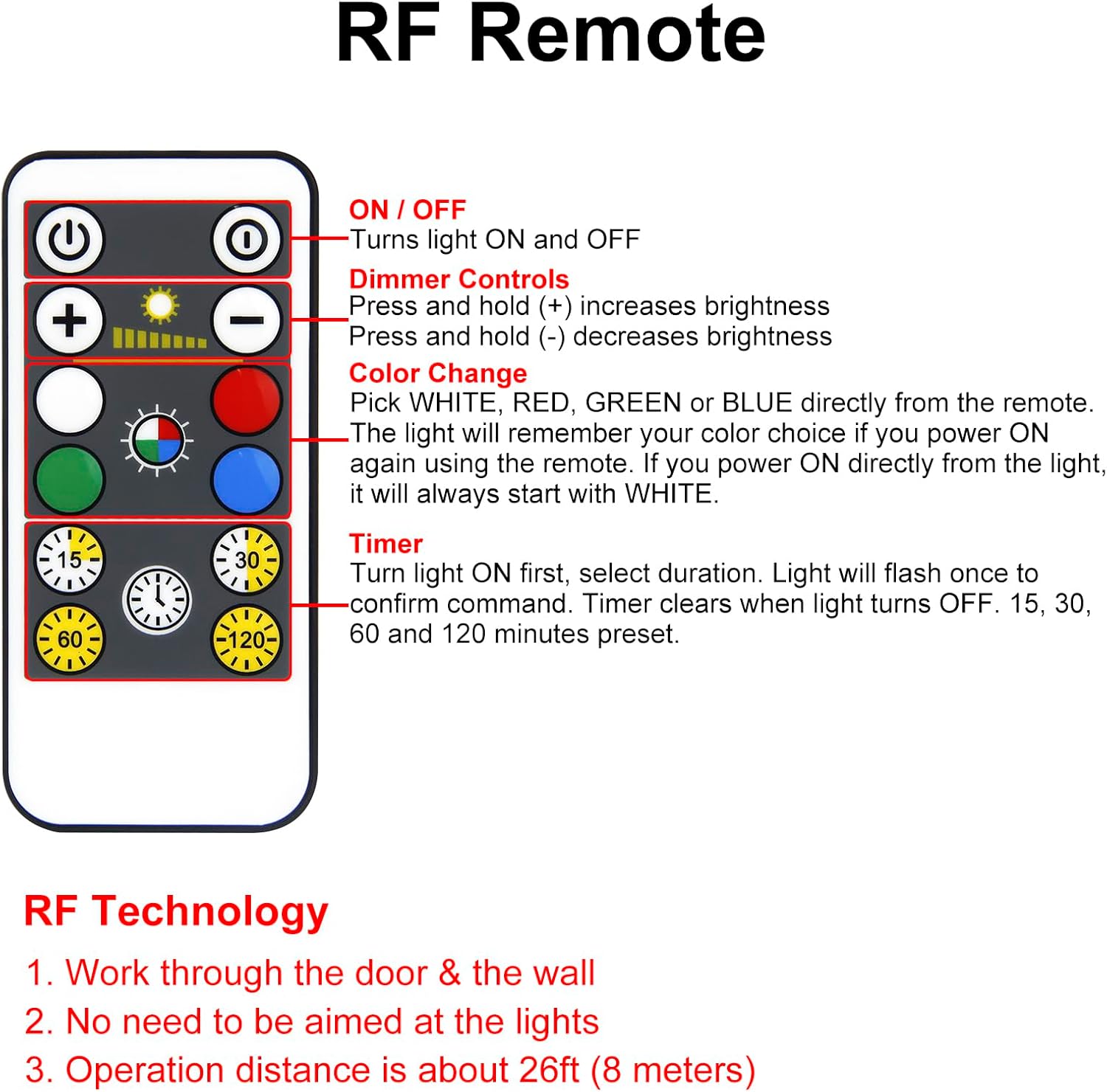 [Battery Operated Push Light]Every gentle operates on 3pcs AAA batteries (not included), providing a wire-free and transportable lighting resolution. The RF distant requires 1pc CR2025 Lithium Steel battery and no meeting, offering handy and versatile utilization
