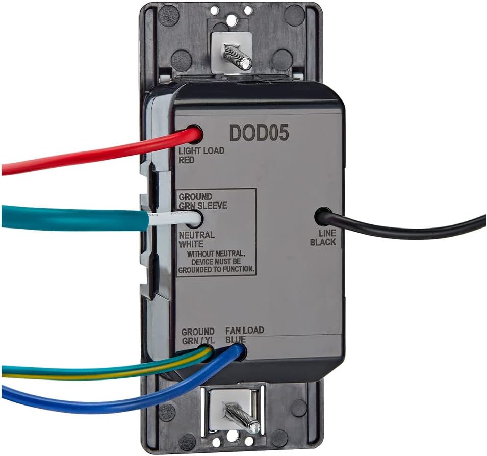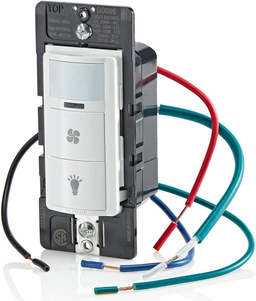 Decora Mixture Occupancy Sensor with Fan Swap, single pole/single pole. Fan Load (Blue Wire): 1/4 HP Fan, 300W LED/CFL, 600W Incandescent/Halogen, 400VA MLV/ELV. Gentle Load (Crimson Wire): 150W LED/CFL, 250W Incandescent/Halogen, 200VA MLV, 250VA ELV, 2A Resistive. Might be put in with or with out a impartial wire, wallplate bought individually. Can be utilized to adjust to the necessities of 2019 and 2022 California Title 24, Half 6, Computerized-off Controls – White