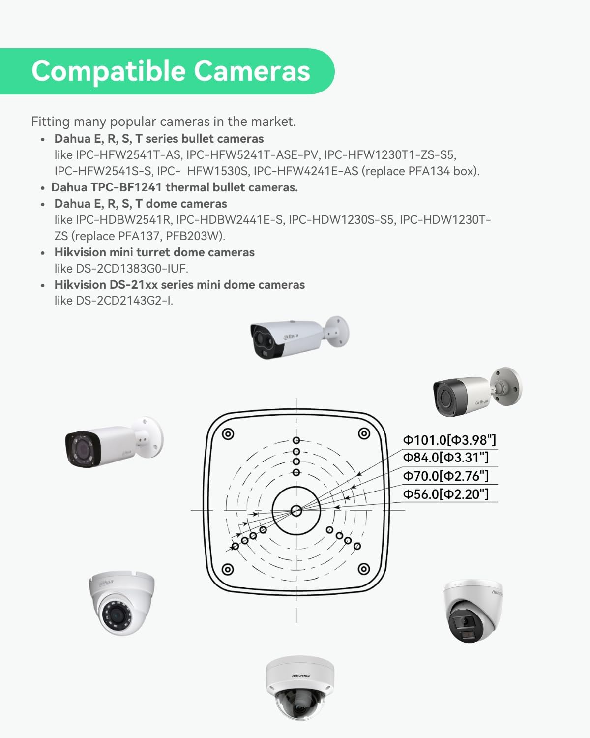 FITTING MANY POPULAR CAMERAS IN THE MARKET: – Dahua E, R, S, T collection bullet cameras, like IPC-HFW2541T-AS, IPC-HFW5241T-ASE-PV, IPC-HFW1230T1-ZS-S5, IPC-HFW2541S-S, IPC-HFW1530S, IPC-HFW4241E-AS (exchange PFA134 field) – Dahua TPC-BF1241 thermal bullet cameras – Dahua E, R, S, T dome cameras, like IPC-HDBW2541R, IPC-HDBW2441E-S, IPC-HDW1230S-S5, IPC-HDW1230T-ZS (exchange PFA137, PFB203W) – Hikivsion mini turret dome cameras, like DS-2CD1383G0-IUF. – Hikvision DS-21xx collection mini dome cameras, like DS-2CD2143G2-I