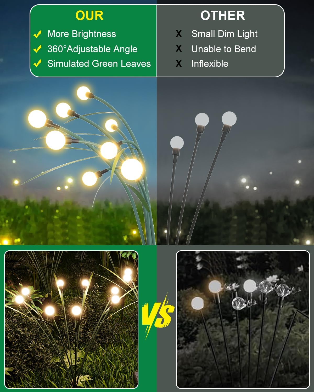 2 Lights Modes: Our newest design of out of doors photo voltaic lights has 2 lighting modes: regular on and flashing, which might meet your totally different ornamental lighting preferences. Every mild has 8 bigger and brighter LED beads. Lighting vary is wider than extraordinary small LED beads. The comfortable heat mild can defend your eyes. No set up and wires are required. Simply plug the firefly lights the place you need to use it. Create a refined life with a tranquil mild feeling.