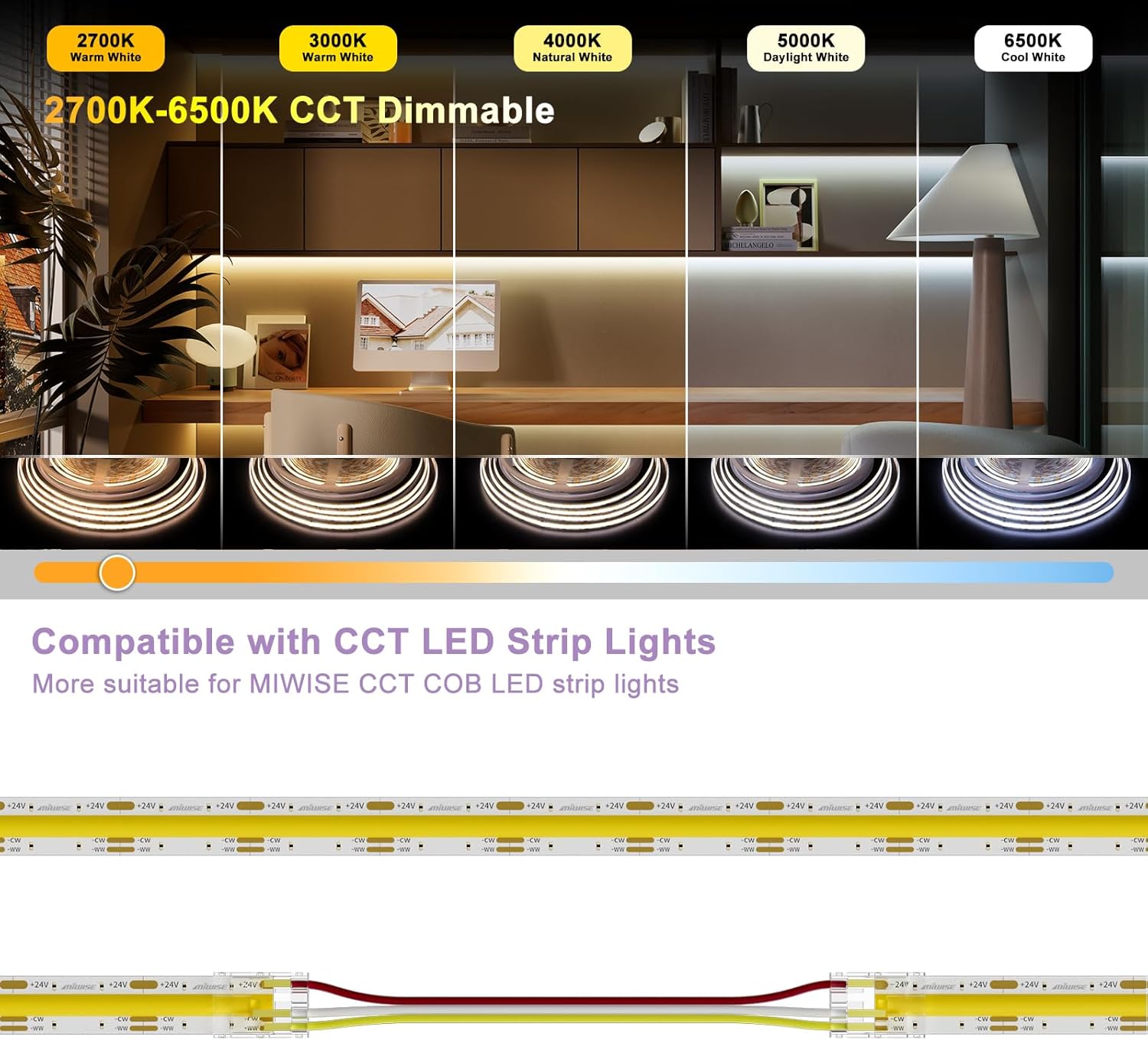 Compatibility: Suitable with MIWISE 3-pin CCT COB LED strips and most 3-pin plug CCT LED strip lights. Enter voltage: DC12-24V. PWM most output present: 3A(DC12V<36W; DC24V<72W).