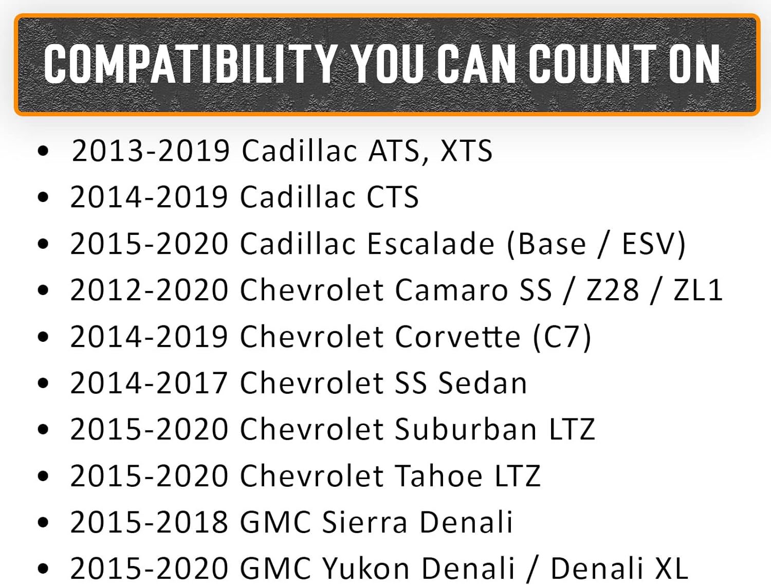 This package is plug & play appropriate with the next GM automobiles: 2013-2019 Cadillac Escalade, GMC Yukon Denali, Denali XL, Chevrolet Suburban, and Tahoe. (for older automobiles please verify our different Amazon itemizing). Please consult with the compatibility picture on the left. Verify your unique, lively, digital strut’s digital connection. For a direct-fit, plug & play compatibility the connector ought to appear like the connector on our digital strut bypass module, if it seems to be completely different you’ll need to buy a separate, cheap common adapter (see our different listings).