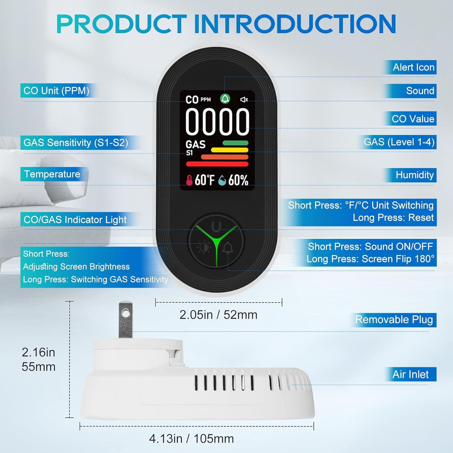 【4-STAGE SOUND & LIGHT ALARM】Mixed carbon monoxide and gasoline detector can current 4-stage icons and indicators in line with the focus of CO and flamable gases within the air. CO: 0~50 PPM or Gasoline: Lv1<5% (Inexperienced=Good), CO: 51~100 PPM or Gasoline: 5%【EASY TO INSTALL & READ】The CO detector is plug-and-play plug-in design, appropriate for any normal AC outlet with a voltage of 100-220V. The modern and compact design makes it simple to combine into your property. The two-inch colourful display screen shows carbon monoxide, flamable gases, temperature and humidity in a straightforward to grasp approach. At night time, you can even make the display screen mild up or flip off for straightforward viewing.