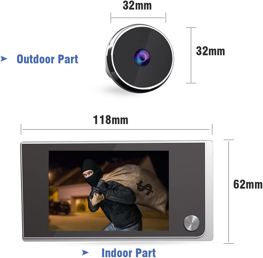 LCD Display 3.5 inch Decision 480*320 Actual viewing angle 120 diploma Door gap Diameter 14-28mm Door thickness 40-100mm Indoor machine measurement 32mm Out of doors machine measurement 118*62mm Materials Zinc Alloy Energy provide 4pcs AAA batteries( Not included ) Bundle contains: 1 x Out of doors Unit, 1 x Indoor Unit, 1 x Pack of screws, 1 x Steel bracket