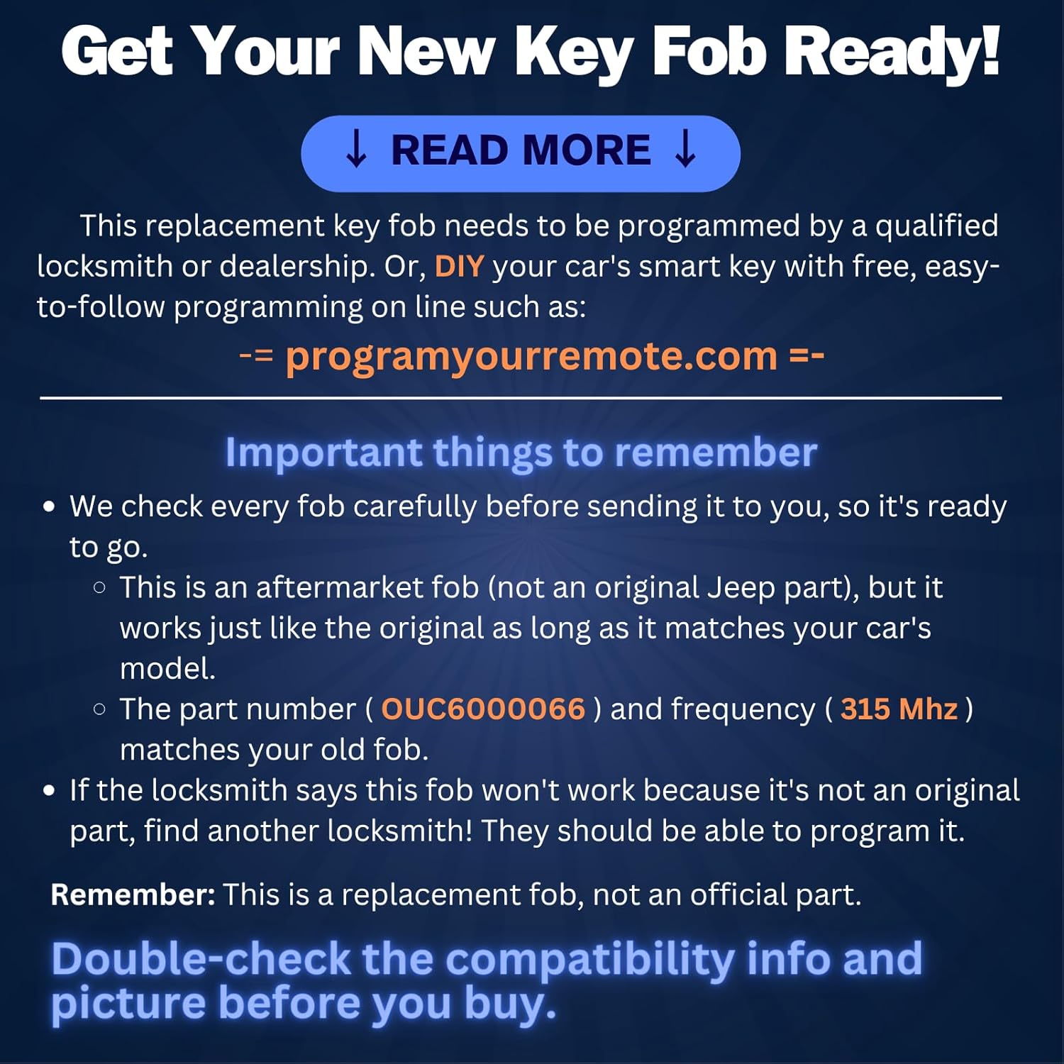 In case you are having bother programming this keyless entry distant automobile key fob, please seek the advice of a number of locksmiths to make sure success. Do not wait till after the important thing has been minimize to seek out out it would not work, which might lead to a loss. Please verify that the unique key has the identical button sample and that the automobile is provided with the push-to-start possibility. Please verify the unique key’s half quantity/FCC ID and product image with the unique one earlier than buying. Programming is straightforward – this automobile key fob have to be programmed and minimize by a certified locksmith or dealership.This can be a non-OEM product, accent solely!