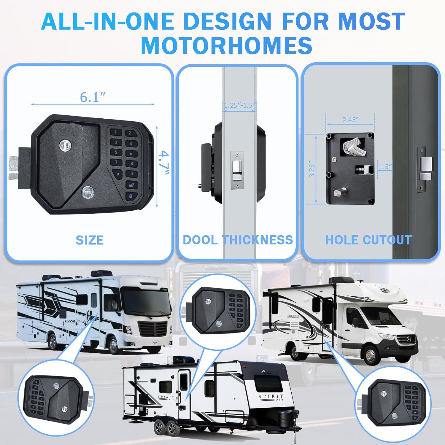 Clever RV Door Lock: This caravan door lock could be arrange with a distant management swap inside, which might notice the automated locking perform after closing the door, and might management the caravan in 3 ways: key, distant management, and password. When you’re away out of your RV, you’ll be able to relaxation assured with out having to fret about valuables. The RV door lock could be put in in lower than 10 minutes utilizing the included equipment, and the code could be set in line with the directions.