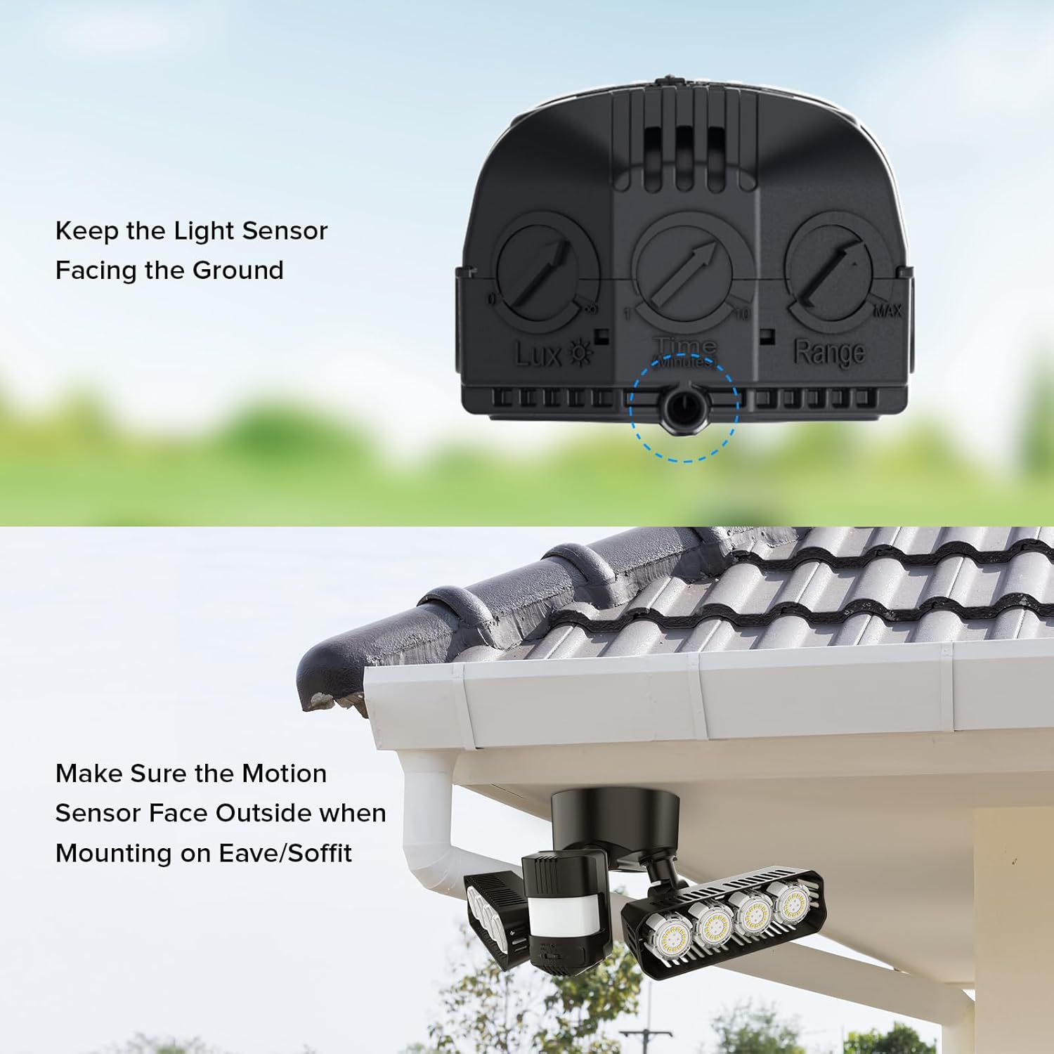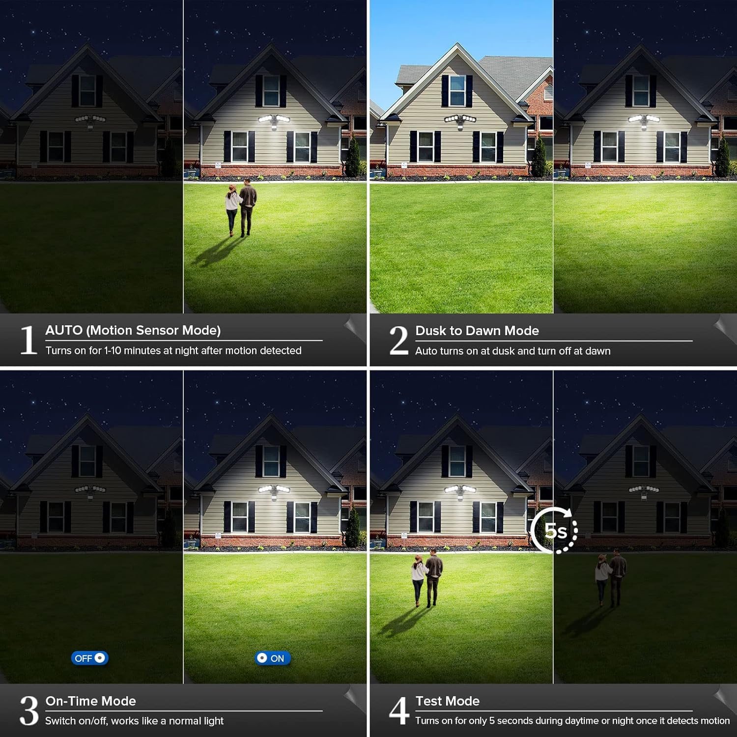 4 Modes Management: AUTO(Movement Sensor Mode), Detect ambient movement to activate the sunshine. The max. detection vary is 72 FT and the detection angle is 180°. Nightfall to Daybreak Mode, Auto activates at nightfall and switch off at daybreak. On-Time Mode, Guide management lights preserve ON by swap. Advocate Lux setting is midway on the Lux dial.
