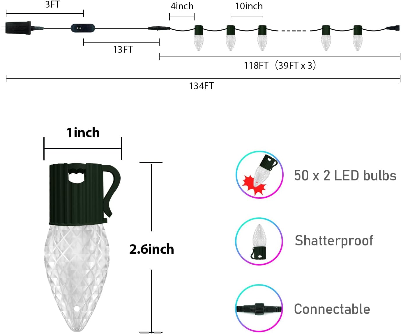 Expandable and Sturdy Design: Constructed to final, these waterproof C9 Christmas Lights might be prolonged as much as 234 ft, connecting as much as 6 units end-to-end. Preferrred for adorning giant areas like patios, roofs, or yards with ease