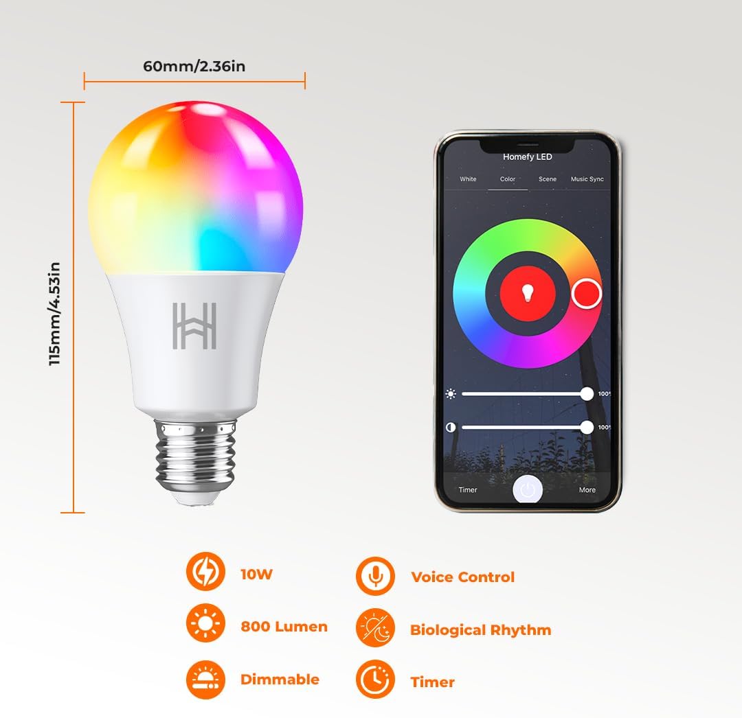 Vivid RGB Coloration Palette: Rework any room with 16 million customizable colours. Whether or not you’re internet hosting a celebration, enjoyable with a film, or matching seasonal decor, these Homefy Sensible Bulbs allow you to simply set the proper temper by way of the smartphone app.