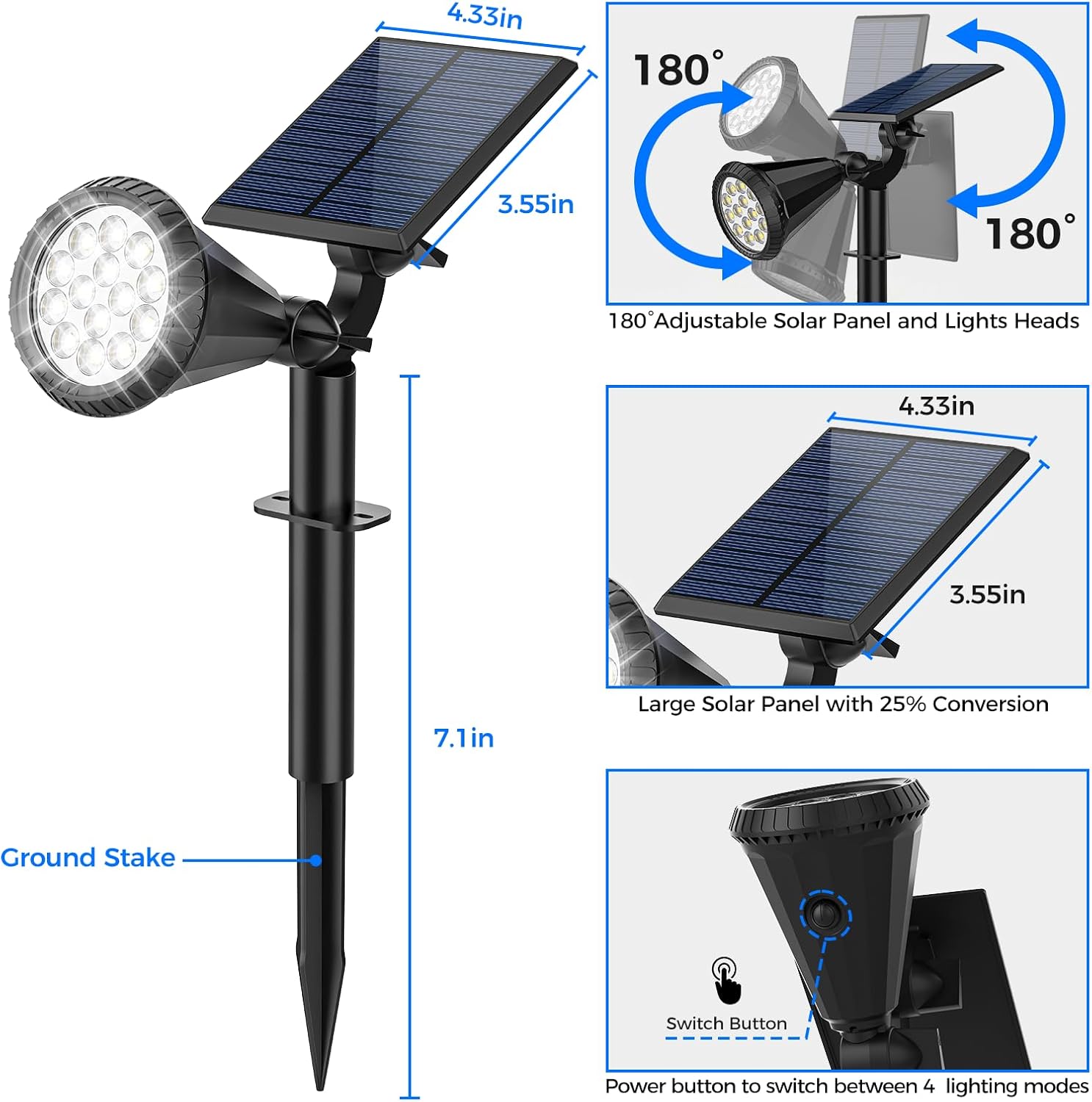 Excessive High quality & IP65 Waterproof : The photo voltaic out of doors lights are manufactured from sturdy ABS materials. IP65 waterproof photo voltaic spotlights stand up to all kinds of harsh climate reminiscent of rain, snow, wind and frost, excessive temperatures, and so forth. The working temperature is from -4℉ to 140℉ and you may place these photo voltaic lights out of doors wherever. Our photo voltaic spotlights gives glorious outcomes for out of doors lighting from nightfall to daybreak