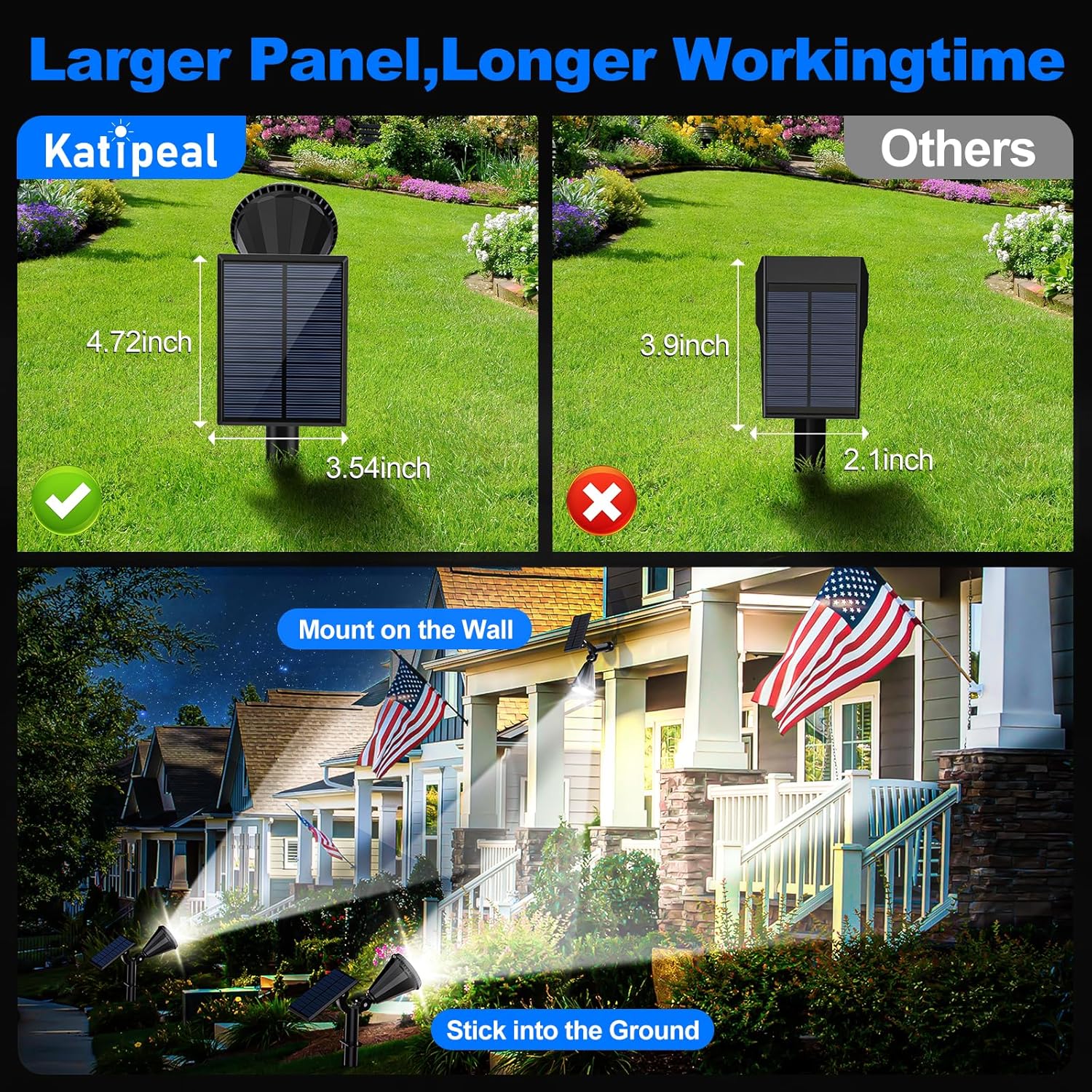 Adjustable Photo voltaic Spotlights:Katipeal photo voltaic spotlights present versatile lighting with adjustable angles.The highlight and photo voltaic panel can independently rotate 180 levels up and down, permitting you to optimize photo voltaic vitality seize and obtain the right lighting angle. The photo voltaic vitality conversion charge is as much as 25% through the use of the bigger monocrystalline silicon photo voltaic panels, extremely decreasing the charging time
