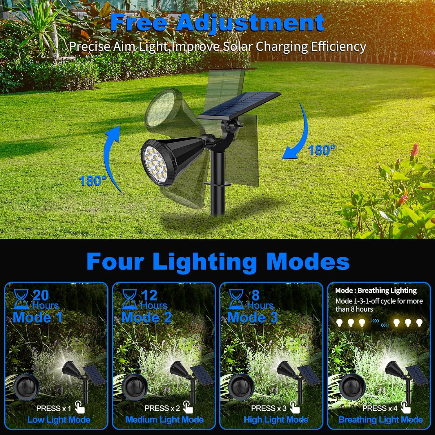 4 Brightness Lighting Modes: With the push of a button, our photo voltaic backyard spotlights out of doors can simply swap between low mild mode(18 hours), medium mild mode(12 hours), excessive mild mode(6 hours) and respiration mild modes (8 hours). The out of doors mild meets your mild wants in all brightness ranges. 4 brightness lighting modes are excellent for making a ambiance and illuminating timber, statue,flag, and so forth.