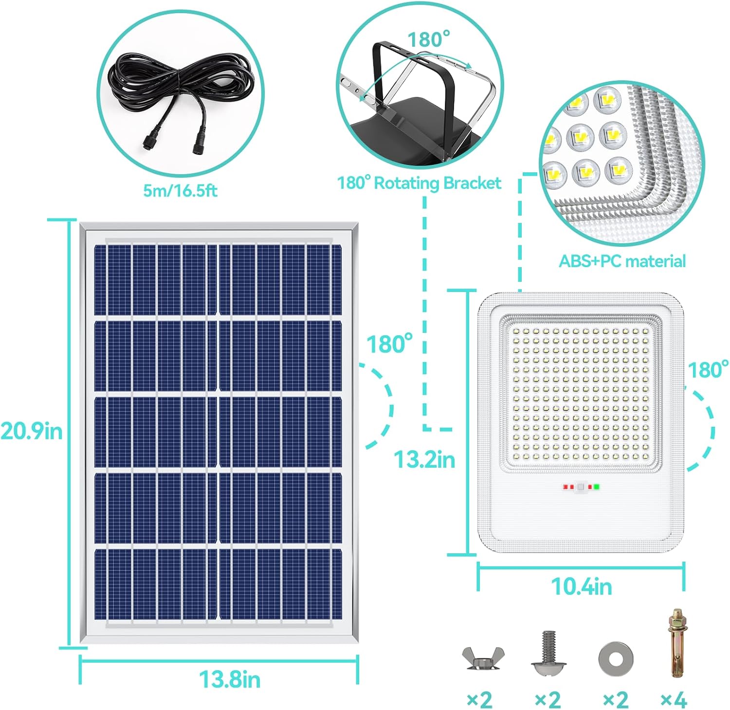 Straightforward Set up – 2 methods of set up, one is hanging, one other is fastened with screws, screw equipment within the package deal included in package deal. What’s extra, there may be extension 5 meters cable to attach the photo voltaic panel to flood gentle