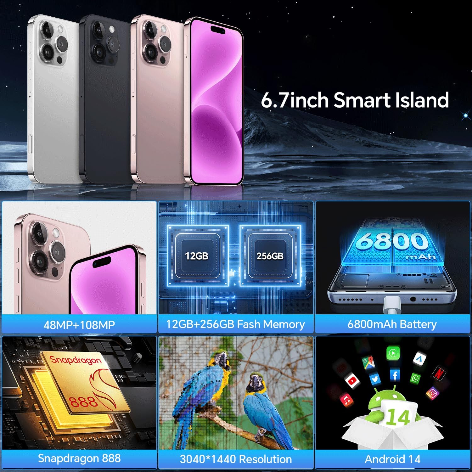 Unlocked G16 ProMax Cell Phone, 12+256GB Smartphone, Android 14 Phone, 48+108MP Camera, Long Battery Life 6800mAh, Dual SIM, 6.7“ HD Screen,Face ID/Fingerprint Lock/GPS/Bluetooth