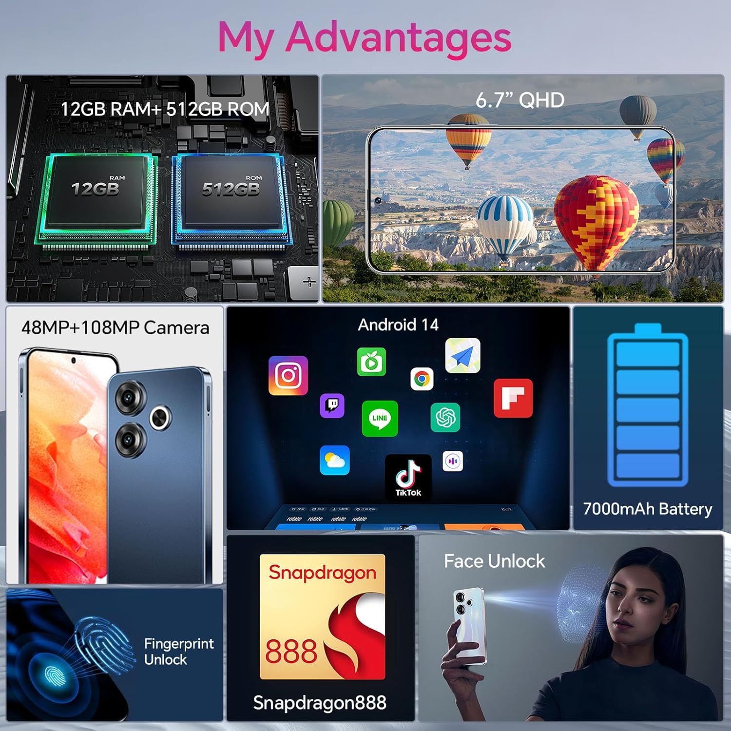 Unlocked Phones E19, 12GB +512GB Android 14 Mobile Phone, 6.7″ HD+ 120Hz 5G Smartphone, Snapdragon 888, 48MP+108MP Dual Camera, 6800mAh Battery, Face ID/Fingerprint Lock/GPS/Bluetooth/Blue