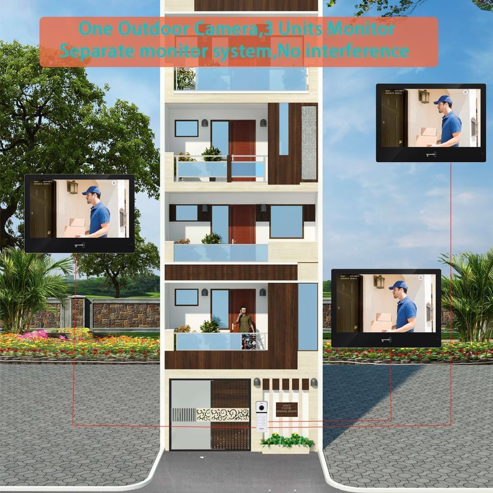 3 Unit Design: 1 outside digicam and three indoor 10 inch contact screens for visible intercom doorbell system, helps three occupants in a single constructing. Particular person screens with out interfering with one another