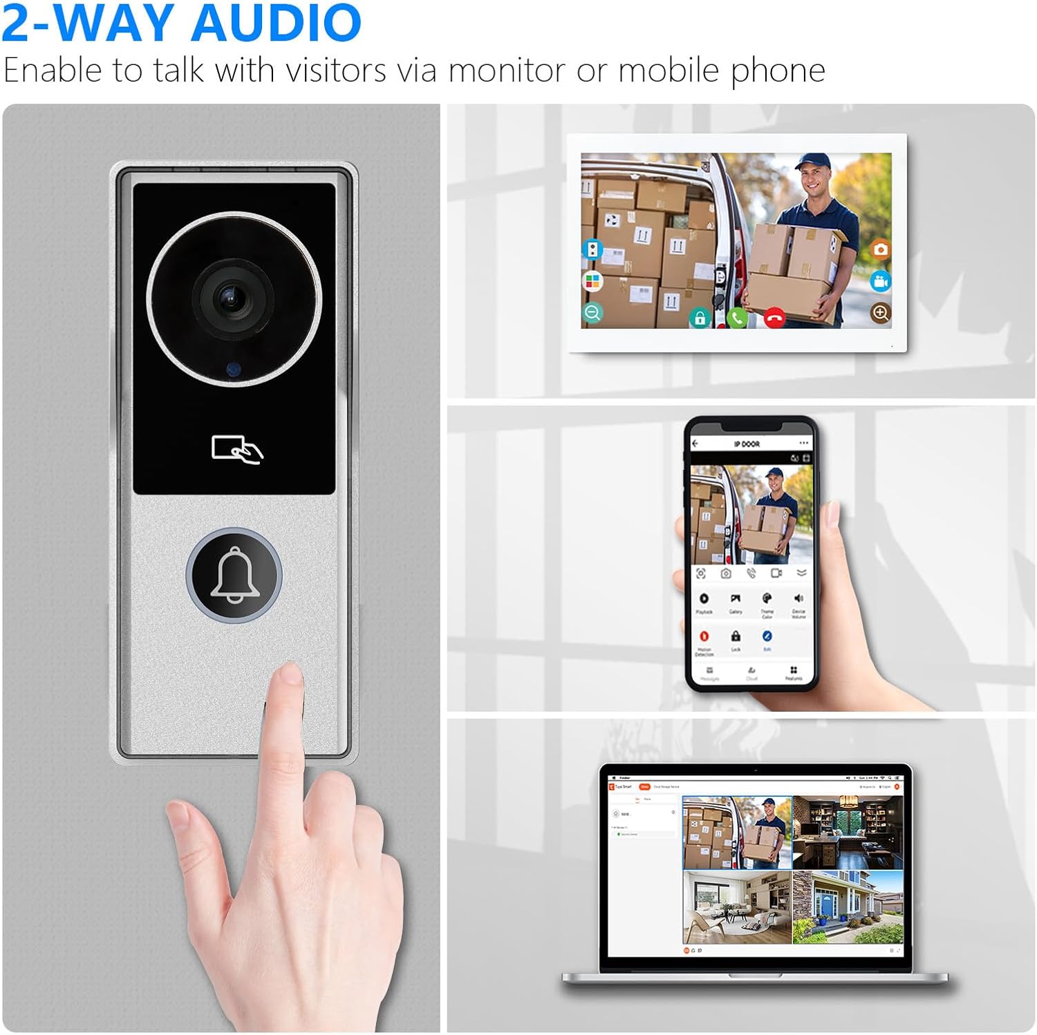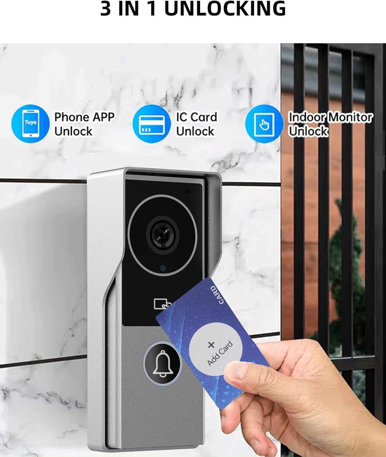3 IN 1 UNLOCKING:Our video doorbell has 3 unlocking strategies, you may unlock the door by IC card, APP and monitor. Very handy and versatile. The scope of provide consists of 5 passes. Straightforward to arrange, so you may open the door anytime, anyplace