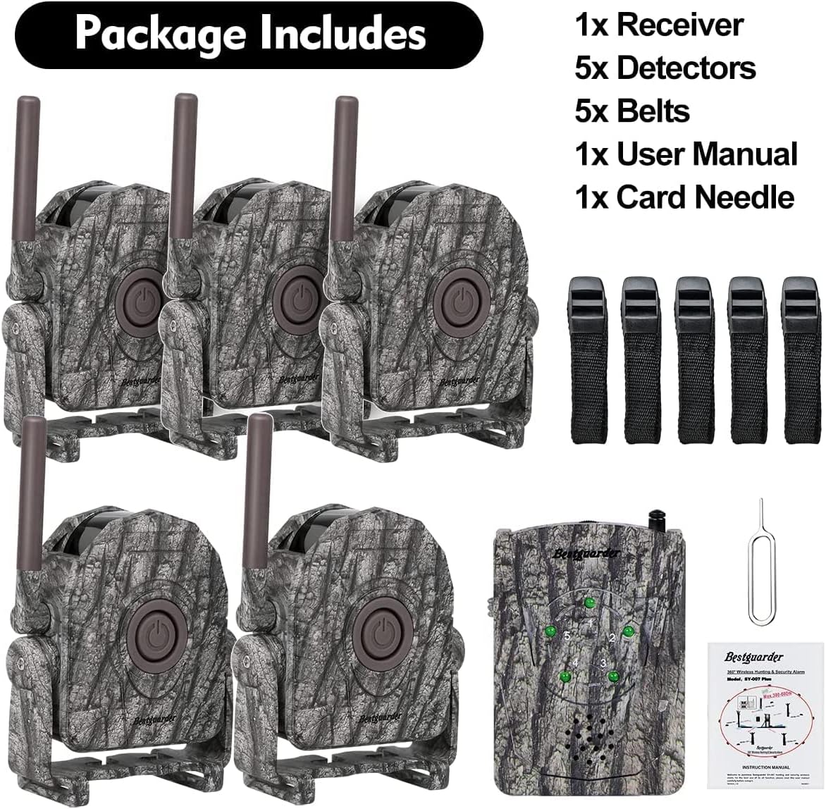 Bestguarder SY-007Plus is a wi-fi alarm system comprises one 433MHz wi-fi receiver and 5 passive infra-red (PIR) movement detectors, when the detector is triggered by a movement in 0-15M open distance, a wi-fi sign inside a most vary of 300M is transmitted to the receiver, a 15 seconds vibration, a 15 seconds LED mild and a 15 seconds sound can establish which detector has been triggered.This searching alarm set might be situated on the tree, for the structure of the entice, organized outdoors the fence or blind and many others.. Animals might be felt inside 300m. In your searching vary, you’ll obtain the alarm from the receiver in your hand in the course of the day or night time, so you’ll be able to precisely know tips on how to know a sure place.