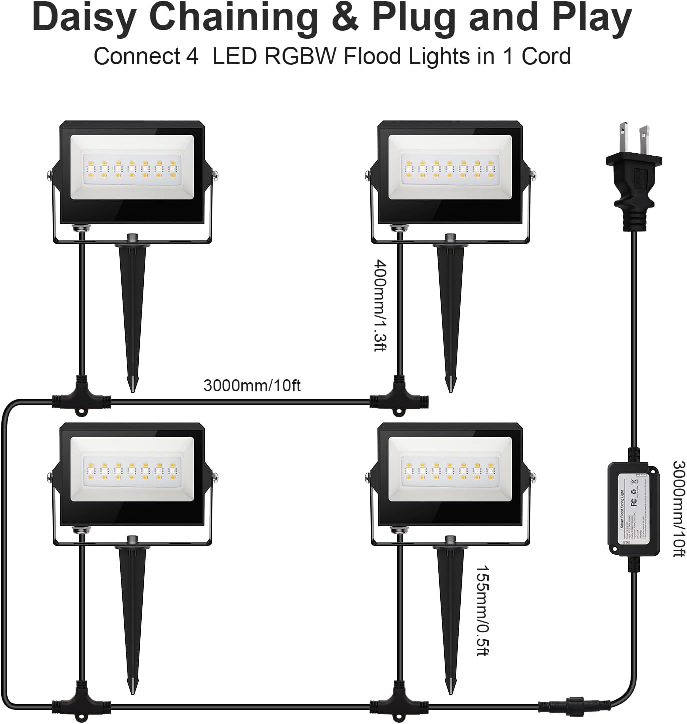Daisy Chaining & True Plug and Play: Join 4 RGBW LED flood lights in 1 wire and energy all them with one adapter one socket. Plug and play, the space between every 2 lights is 10ft, straightforward to mount them outside