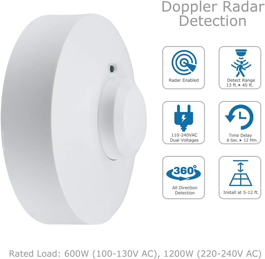 New era doppler radar detection technologyClassic UFO Form, white trendy profile360°detection, adjustable period and sensitivityMaintain constant sensitivity and superior to PIR movement sensors.Low energy emission. Protected to make use of for the person.