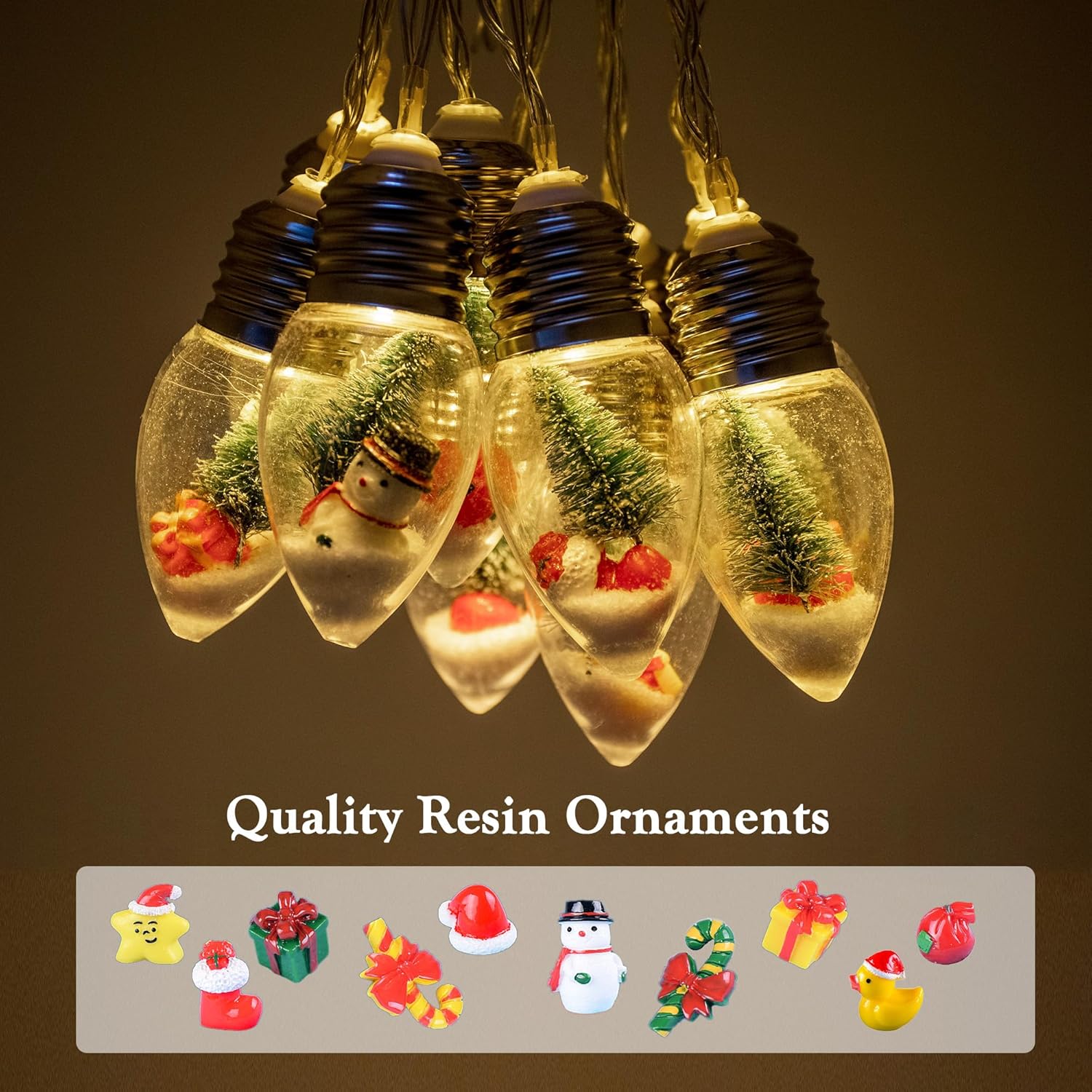 Whimsical Christmas Ornament: The bulb fairy lights options 10 candle-shape bulbs being stuffed with snow, a mini Christmas tree and cute Christmas ornaments. Illuminated with white LED lights from inside, it creates a magical little snowy scene and Christmas pageant environment